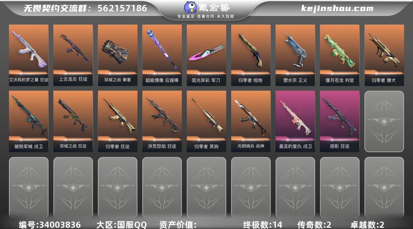 【套装】:《双城之战》收藏套装,归零者套装 【英雄】:幻棱,炼狱,维斯,暮蝶,钛狐,壹决,铁臂,捷风,雷兹,幽影,不死鸟,贤者,猎枭,蝰蛇,零,芮娜,奇乐,尚勃勒,霓虹,斯凯,夜露,星礈,K/O,海神,盖可,黑梦,钢锁 【近战武器】:近战武器-双城之战 拳套,近战武器-超能偶像 应援棒,近战武器-弧光异彩 军刀,近战武器-生物收割器 【狂徒】:狂徒-归零者,狂徒-洪荒怒焰,狂徒-双城之战,狂徒-艾沃莉的梦之翼,狂徒-上古龙炎,狂徒-掠影,狂徒-超能偶像,狂徒-弧光异彩 【幻影】:幻影-噬源兽防卫工程,幻影-聚合之力 【戍卫】:戍卫-破败军械,戍卫-盖亚的复仇,戍卫-超能偶像,戍卫-彩梦之城 【獠犬】:獠犬-归零者,獠犬-弧光异彩,獠犬-采蜜小蜂队 【冥驹】:冥驹-归零者 【飞将】:飞将-聚合之力,飞将-信手涂鸦 【战神】:战神-光明哨兵,战神-采蜜小蜂队 【奥丁】:奥丁-信手涂鸦 【判官】:判官-偃月苍龙,判官-超能偶像,判官-采蜜小蜂队 【雄鹿】:雄鹿-彩梦之城 【骇灵】:骇灵-信手涂鸦 【蜂刺】:蜂刺-弧光异彩,蜂刺-聚合之力 【标配】:标配-超能偶像,标配-彩梦之城 【正义】:正义-塑水宗,正义-超限闪存,正义-纳米打击 【鬼魅】:鬼魅-诡...