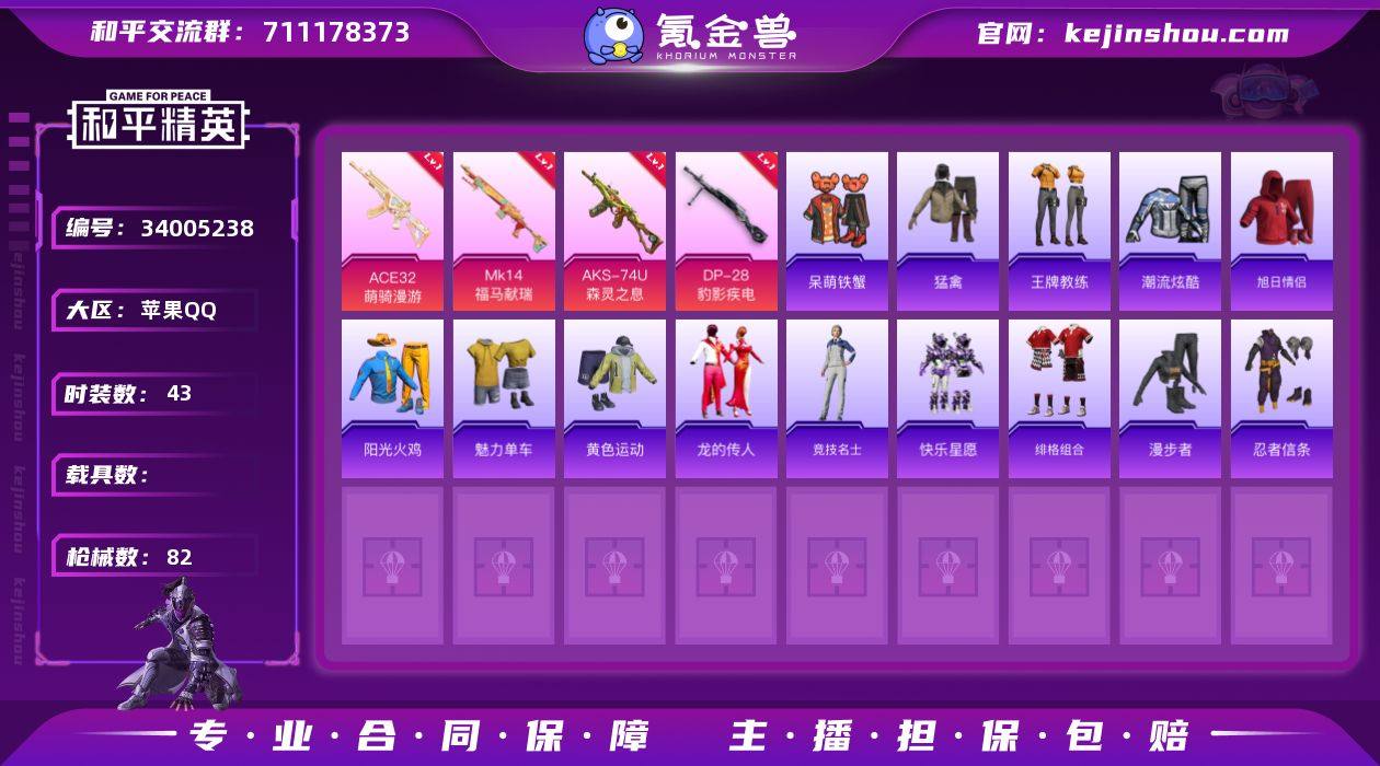 可二次【1粉装4特效枪 可秒换绑不用等】 苹果Q区-19921热力值-43套装-82枪皮 【1粉装】 鸢尾珑雾【4特效枪】 Mk14-福马献瑞(5级) AKS-74U-森灵之息(5级) ACE32-萌骑漫游(4级) DP-28-豹影疾电(5级)【7热门】 M416-蓝色火焰 长空猛禽 忍者信条 MG3-幻世战舞者 AKM-星之彼岸 呆萌铁蟹 营地ID:939534861