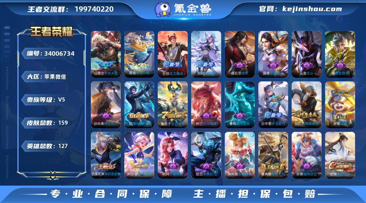 AL707502 【小号微信全正常带微信-发育路24段中路20-159皮孙悟空齐天大圣3银标,狂铁龙之律动,梦奇顽趣,苏烈春野闲踪,钟馗虚灵犬护,阿轲化蝶舞,太乙真人谧流熔炉,庄周高山流水,百里玄策原初追逐者,沈梦溪龙舞盛年,云中君纤云弄巧,鬼谷子天穹祈灯,蒙恬荣光圣徽,蒙犽百解令,】 皮肤数159 传说皮肤数1 史诗皮肤数32 英雄数127 营地id1835125246 贵族等级【文本】贵族5级 【贵族5级】 内测皮肤1 限定皮肤36 赛季限定20 史诗皮肤33 战令限定2 勇者皮肤76 其他皮肤48 内测皮肤:高渐离玩趣恶龙; 限定皮肤:狂铁龙之律动,梦奇顽趣,苏烈春野闲踪,钟馗虚灵犬护,阿轲化蝶舞,太乙真人谧流熔炉,庄周高山流水,百里玄策原初追逐者,沈梦溪龙舞盛年,云中君纤云弄巧,鬼谷子天穹祈灯,蒙恬荣光圣徽,蒙犽百解令,高渐离玩趣恶龙,裴擒虎擒涛扼浪,赵云皇家上将,孙悟空齐天大圣,桑启海盐诗旅,元歌无心,鬼谷子五谷丰年,李元芳云中旅人,项羽海滩派对,雅典娜黎明之约,沈梦溪大漠名商,兰陵王金庭之子,达摩沙漠行僧,苏烈千军破阵,钟馗驱傩正仪,狄仁杰阴阳师,狄仁杰鹰眼统帅,程咬金演武夺筹,亚瑟潮玩骑士王,狄仁杰万华元夜,阿古朵江河有灵,鲁班大师探海日志...