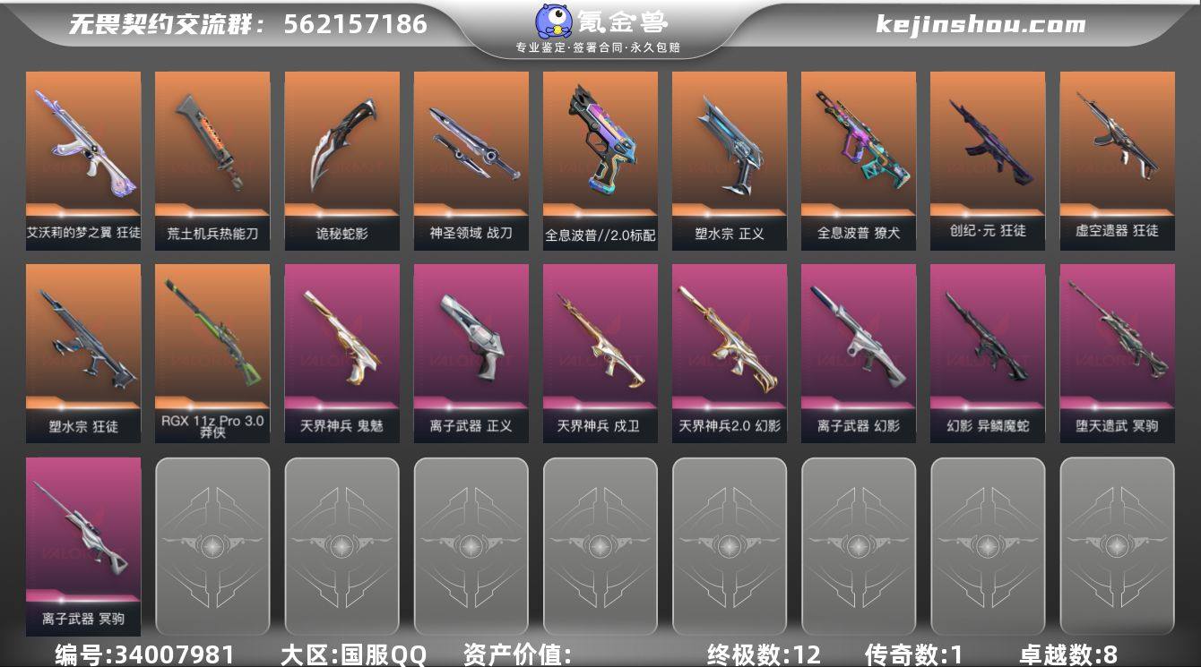 LV等级159/皮肤总价值29300/段位铂金/总皮肤数量67/刀皮数量5/枪皮数量62/具体详情请看图/幻棱/炼狱/维斯/暮蝶/钛狐/壹决/捷风/雷兹/幽影/不死鸟/贤者/猎枭/蝰蛇/芮娜/霓虹/夜露/神之刃/穿花蝴蝶/荒土机兵热能刀/诡秘蛇影/神圣领域 战刀/狂徒-塑水宗/狂徒-创·纪元/狂徒-虚空遗器/狂徒-艾沃莉的梦之翼/狂徒-荒土机兵/狂徒-诡秘蛇影/幻影-离子武器/幻影-天界神兵2.0/幻影-异鳞魔蛇/幻影-神圣领域/幻影-纳米打击/幻影-末日之翼/戍卫-天界神兵/戍卫-逆冲蛮牛/戍卫-月球哨兵/戍卫-折光棱晶/獠犬-全息波普/獠犬-神圣领域/獠犬-逆冲蛮牛/冥驹-堕天遗武/冥驹-离子武器/冥驹-荒土机兵/冥驹-模拟赫兹/冥驹-星云暗涌/飞将-末日之翼/莽侠-RGX 11z Pro 3.0/莽侠-诡秘蛇影/莽侠-月球哨兵/战神-神圣领域/战神-浮光跃金/奥丁-纳米打击/奥丁-末日之翼/判官-诡秘蛇影/判官-纳米打击x/雄鹿-模拟赫兹/雄鹿-逆冲蛮牛/雄鹿-月球哨兵/骇灵-荒土机兵/骇灵-浮光跃金/骇灵-星云暗涌/蜂刺-超限闪存/蜂刺-星云暗涌/蜂刺-折光棱晶/标配-全息波普//2.0/标配-荒土机兵/标配-浮光跃金/标配-折光棱晶/正义-塑水宗/正义-离子武器/正义-纳米打击/正义-月球哨兵/鬼魅-天界神兵/鬼魅-诡秘蛇影/鬼魅-模拟赫兹/鬼魅-星...