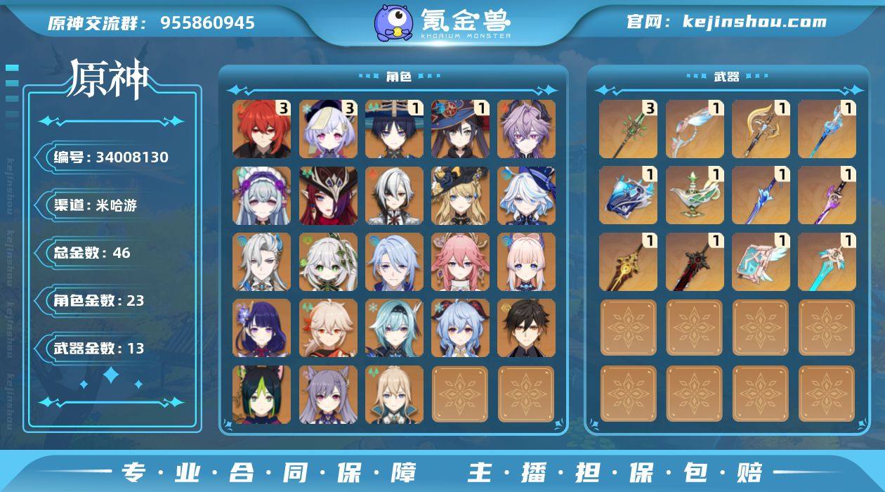 60级/46黄/男主/23个五星角色/13个五星武器/恰斯卡/那维莱特/一命流浪者/梦见月瑞希/钟离/甘雨/八重神子/雷电将军/刻晴/纳西妲/珊瑚宫心海/娜维娅/枫原万叶/优菈/芙宁娜/神里绫人/阿蕾奇诺/琴/三命七七/提纳里/一命莫娜/三命迪卢克/杜林/万世流涌大典/千夜浮梦/和璞鸢/裁断/苇海信标/狼的末路/静水流涌之辉/波乱月白经津/雾切之回光/天空之刃/天空之卷/白雨心弦