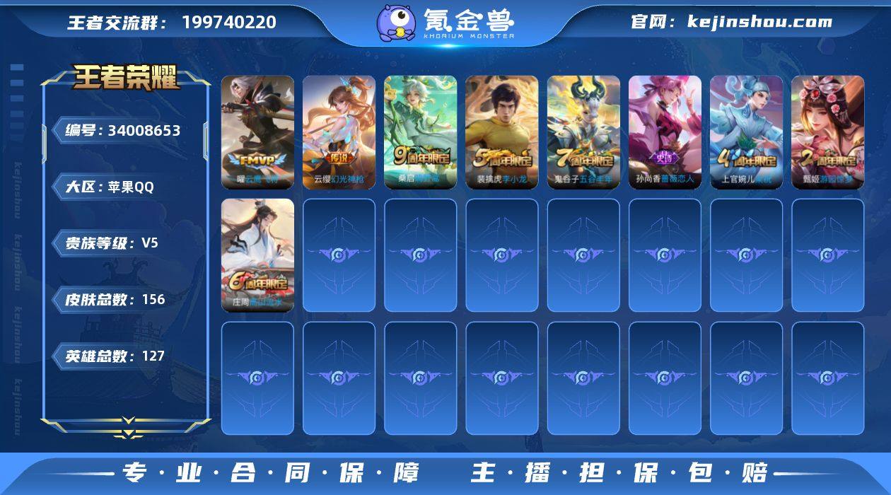 苹果Q 可二次 4传说 127英雄156皮肤 幻光神枪 愿照众生和 鸣野蒿 云鹰飞将 冰冠公主 黎明之约 梁祝 伽罗琥珀纪元 雪夜绮愿 原初探秘者 李小龙 水晶猎龙者 猫狗日记男 猫狗日记女 金属风暴 蔷薇恋人 黄金分割率 逐浪之夏 千年之狐 功夫厨神 圣诞恋歌 乘风破浪 圣诞狂欢 节奏热浪 绅士熊喵 时之恋人女 街头霸王 箭羽风息 缤纷独角兽 鬼剑武藏 冰雪圆舞曲 狰 重明 穷奇 御狮 御霄 御旌 御銮 朔风刀 混沌棋 疑决卦 醍醐杖 万华元夜 东方不败 演武夺筹 群星魔术团程咬金 驱傩正仪 千军破阵 沙漠行僧 女仆咖啡 金庭之子 敏锐之力 云中旅人 丁香结 海盐诗旅 皇家上将 擒涛扼浪 魅力维加斯 探海日志 水果甜心 古海寻踪 蔬乡物语鲁班 天穹祈灯 高山流水 江河有灵 顽岩魄 纤云弄巧 游园惊梦 怒海争锋 五谷丰年 鹰眼统帅 王者荣耀账号