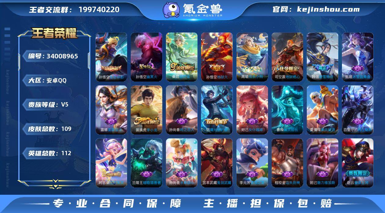 【WZ182994】安卓Q-V5-永恒钻石V段位-112英雄-109皮肤-1典藏皮肤-2传说-21史诗【荣耀典藏】:孙悟空全息碎影【传说皮肤】:桑启鸣野蒿,孙悟空地狱火【限定皮肤】:姜子牙天穹之誓,狄仁杰阴阳师,赵云皇家上将,项羽海滩派对,韩信傲雪梅枪,兰陵王金庭之子,李元芳云中旅人,沈梦溪大漠名商,裴擒虎李小龙,裴擒虎擒涛扼浪,鲁班大师探海日志,桑启海盐诗旅,艾琳流音漫舞,司空震地狱燃心,阿古朵江河有灵,张良古海寻踪,鬼谷子天穹祈灯,刘邦剑破天穹【赛季限定】:兰陵王金庭之子,沈梦溪大漠名商,李元芳云中旅人,桑启海盐诗旅,裴擒虎擒涛扼浪,鲁班大师探海日志,张良古海寻踪,鬼谷子天穹祈灯,刘邦剑破天穹,姜子牙天穹之誓,东皇太一噬灭天穹,太乙真人谧流熔炉,钟馗虚灵犬护【战令限定】:司空震地狱燃心,艾琳流音漫舞,周瑜线条小狗【史诗皮肤】:周瑜线条小狗,阿古朵江河有灵,司空震地狱燃心,镜真我赫兹,韩信傲雪梅枪,裴擒虎李小龙,孙尚香时之恋人,程咬金功夫厨神,李元芳逐浪之夏,铠曙光守护者,百里守约特工魅影,兰陵王暗隐猎兽者,夏侯惇乘风破浪,曹操幽灵船长,妲己女仆咖啡,妲己魅力维加斯,嬴政摇滚巨星,孙尚香水果甜心,宫本武藏鬼剑武...