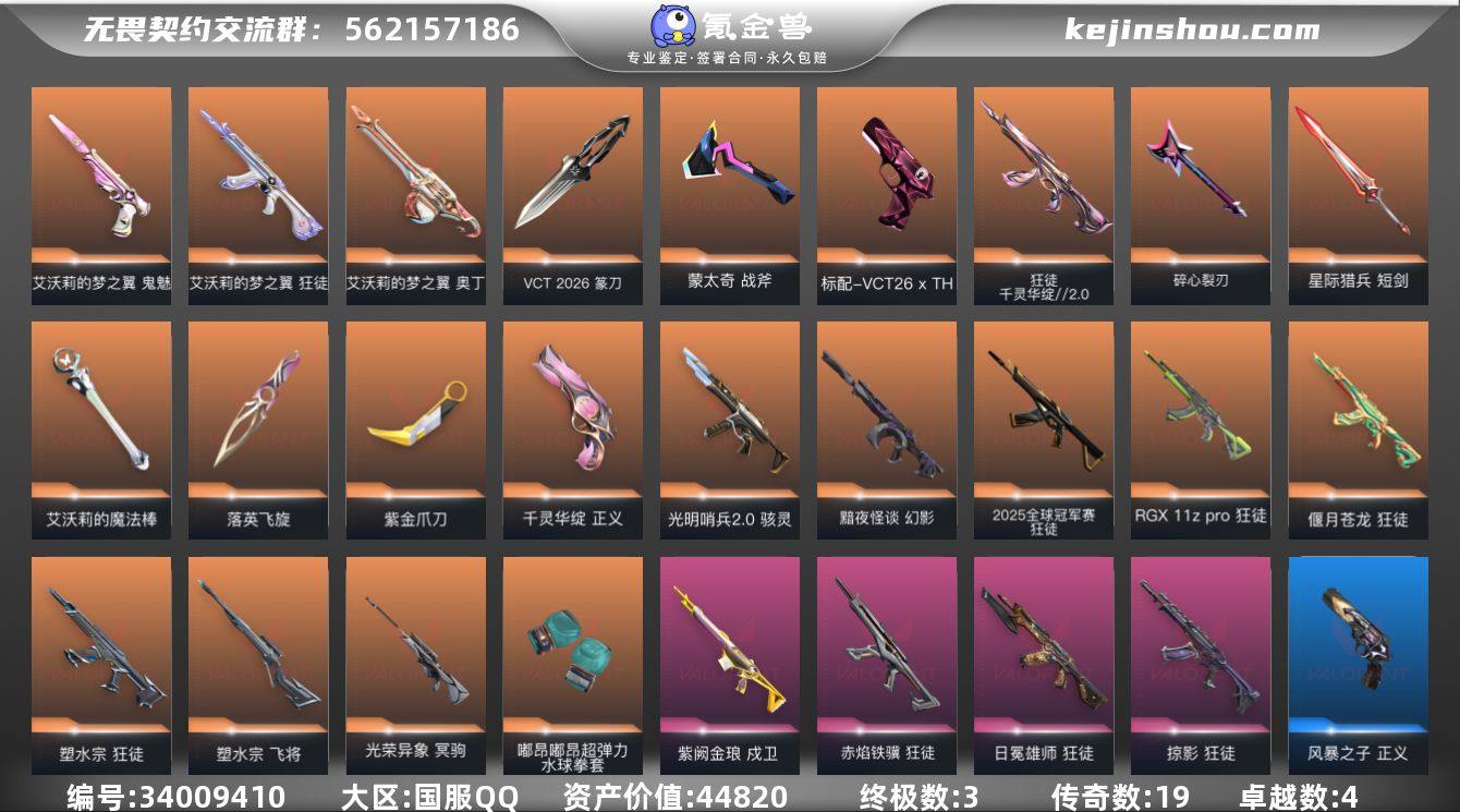 段位: 超凡 近战武器皮肤: 紫金爪刀-紫阙金琅//2.0,落英飞旋-千灵华绽,艾沃莉的魔法棒,星际猎兵 短剑,碎心裂刃,嘟昂嘟昂超弹力水球拳套-滋滋X特攻队,蒙太奇 战斧,VCT 2026 篆刀 步枪皮肤: 戍卫-紫阙金琅,狂徒-偃月苍龙,狂徒-塑水宗,狂徒-日冕雄师,狂徒-艾沃莉的梦之翼,幻影-黯夜怪谈,狂徒-掠影,狂徒-RGX 11z pro,2025全球冠军赛 狂徒,狂徒-千灵华绽//2.0,超集系统 狂徒,蒙太奇 幻影,风暴之子 戍卫,狂徒-赤焰铁骥 佩枪皮肤: 正义-千灵华绽,鬼魅-艾沃莉的梦之翼,标配-VCT26 x TH,超集系统 标配,风暴之子 正义,蒙太奇 狂怒 狙击枪皮肤: 飞将-塑水宗,冥驹-光荣异象,风暴之子 冥驹,超集系统 飞将 冲锋枪皮肤: 骇灵-光明哨兵2.0,蒙太奇 骇灵 霰弹枪皮肤: 风暴之子 雄鹿 机枪皮肤: 奥丁-艾沃莉的梦之翼,蒙太奇 战神 亮点: 【优质装备】:狂徒-塑水宗,狂徒-艾沃莉的梦之翼,狂徒-掠影,狂徒-偃月苍龙,正义-千灵华绽,狂徒-日冕雄师,幻影-黯夜怪谈,狂徒-RGX 11z pro,奥丁-艾沃莉的梦之翼,骇灵-光明哨兵2.0,紫金爪刀,飞将-塑水宗,落英飞旋,鬼魅-艾沃莉的梦之翼,艾沃莉的魔法棒,星际猎兵 短剑,戍卫-紫阙金琅,2025全球冠军赛 狂徒