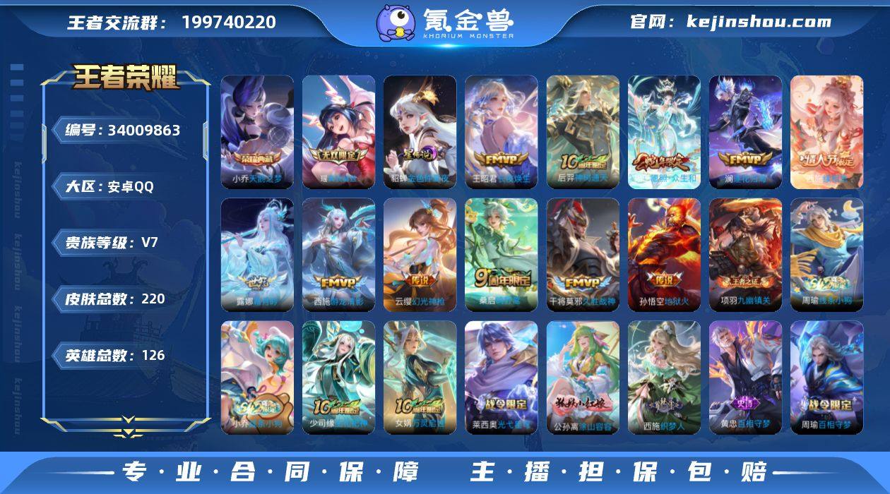 安卓Q-V7-最强王者段位-126英雄-220皮肤-1典藏皮肤-1无双-12传说-66史诗【英雄全皮】:敖隐全皮,西施全皮,戈娅全皮,空空儿全皮【荣耀典藏】:小乔天鹅之梦【无双皮肤】:瑶真我赫兹【传说皮肤】:貂蝉神骥聚万邦,王昭君长夜焕生,后羿神树通天,西施续相思,妲己愿照众生和,云缨幻光神枪,桑启鸣野蒿,澜逐花归海,露娜霜月吟,西施游龙清影,干将莫邪久胜战神,孙悟空地狱火【限定皮肤】:蒙犽顽岩魄,虞姬夏日便利店,姜子牙天穹之誓,杨戬破阵退雄兵,狄仁杰阴阳师,赵云皇家上将,孙尚香蔷薇恋人,庄周高山流水,元歌无心,狄仁杰魔术师,项羽海滩派对,安琪拉魔法小厨娘,李元芳云中旅人,梦奇顽趣,裴擒虎擒涛扼浪,西施玲珑珍味,西施至美乘鲤谣,鲁班大师探海日志,桑启海盐诗旅,戈娅驭风魔法,艾琳女武神,阿古朵江河有灵,张良古海寻踪,妲己灵卜魔法,鬼谷子天穹祈灯,沈梦溪龙舞盛年,刘邦剑破天穹,镜青焰无极,项羽苍威无极,周瑜熔金海岸【年限皮肤】:妲己愿照众生和【赛季限定】:李元芳云中旅人,桑启海盐诗旅,裴擒虎擒涛扼浪,鲁班大师探海日志,张良古海寻踪,鬼谷子天穹祈灯,刘邦剑破天穹,姜子牙天穹之誓,东皇太一噬灭天穹,太乙真人谧流熔炉...