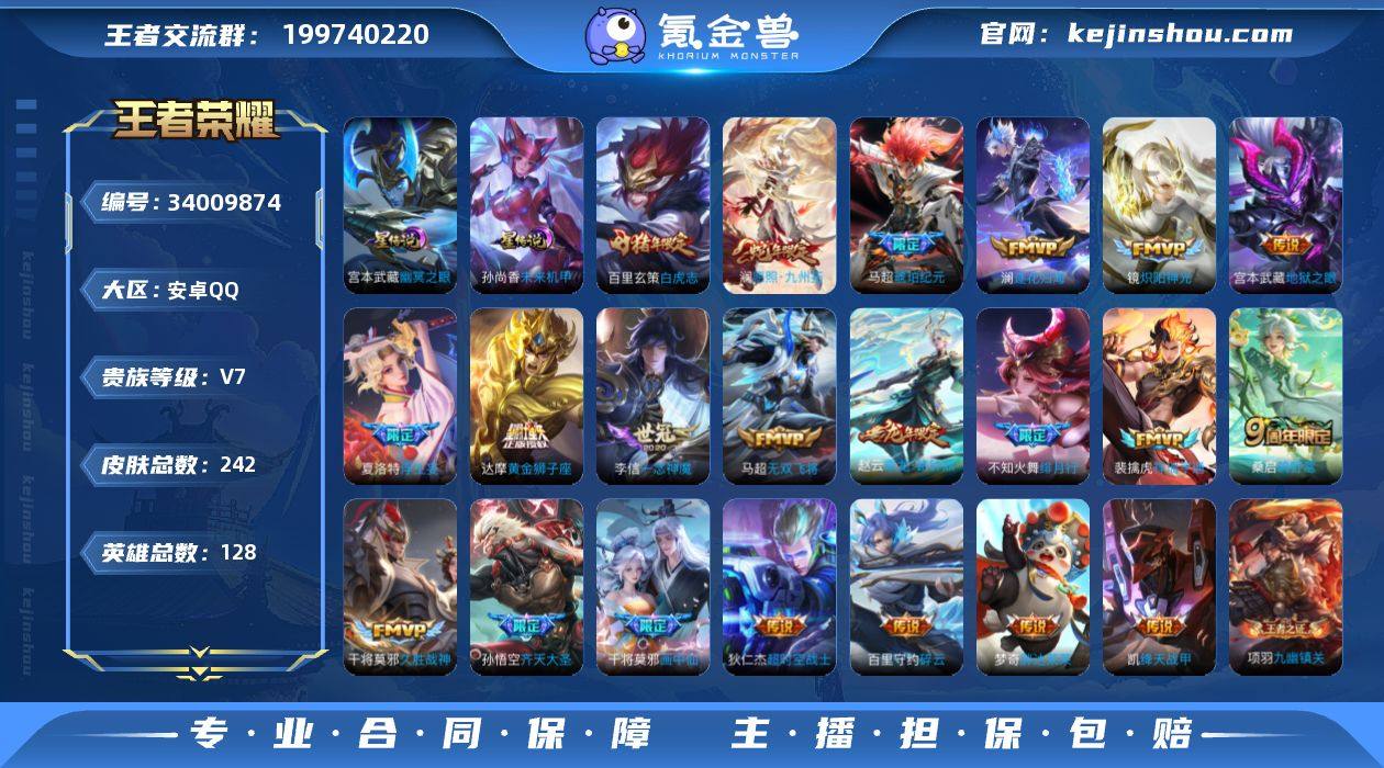安卓Q-V7-至尊星耀I段位-128英雄-242皮肤-24传说-62史诗【英雄全皮】:孙权全皮,敖隐全皮【传说皮肤】:韩信踏浪归,关羽神骥镇沧海,马超神骥逐星野,澜愿照九州拓,裴擒虎祥瑞亨通,桑启鸣野蒿,赵云乘龙铭钟鼎,马超琥珀纪元,澜逐花归海,夏洛特浮生妄,干将莫邪画中仙,孙悟空齐天大圣,不知火舞绯月行,百里守约碎云,马超无双飞将,铠绛天战甲,镜炽阳神光,李信一念神魔,干将莫邪久胜战神,达摩黄金狮子座,百里玄策白虎志,梦奇胖达荣荣,宫本武藏地狱之眼,狄仁杰超时空战士【限定皮肤】:蒙犽顽岩魄,姜子牙天穹之誓,狄仁杰阴阳师,赵云皇家上将,孙尚香蔷薇恋人,高渐离死亡摇滚,钟无艳超时空战士,元歌无心,甄姬落雪兰心,马可波罗山海玄木吟,狄仁杰魔术师,达摩沙漠行僧,项羽海滩派对,兰陵王金庭之子,不知火舞绯月行,孙悟空至尊宝,孙悟空齐天大圣,李元芳云中旅人,干将莫邪画中仙,鬼谷子五谷丰年,苏烈千军破阵,百里玄策白虎志,百里玄策原初追逐者,百里守约朱雀志,沈梦溪大漠名商,裴擒虎李小龙,裴擒虎擒涛扼浪,米莱狄胡桃异想国,云中君纤云弄巧,嫦娥暖冬兔眠,鲁班大师探海日志,桑启海盐诗旅,夏洛特浮生妄,暃星界游侠,艾琳流音漫舞,...
