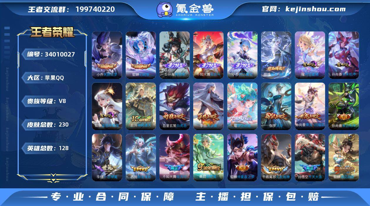 苹果Q-V8-至尊星耀IV段位-128英雄-230皮肤-2典藏皮肤-3无双-2珍品传说-25传说-59史诗【英雄全皮】:不知火舞全皮,敖隐全皮【荣耀典藏】:小乔天鹅之梦,貂蝉幻阙歌【无双皮肤】:公孙离离恨烟,不知火舞花合斗,小乔时之魔女【珍品传说】:伽罗沧流箭,嫦娥器灵落星盏【传说皮肤】:朵莉亚神骥鸣幻洲,貂蝉神骥聚万邦,后羿神树通天,桑启鸣野蒿,孙尚香乘龙问璇玑,孙悟空齐天大圣,不知火舞绯月行,王昭君星穹之声,大乔挚爱花嫁,瑶时之祈愿,孙尚香异界灵契,貂蝉遇见胡旋,西施游龙清影,虞姬启明星使,李信一念神魔,伽罗太华,张良黄金白羊座,干将莫邪久胜战神,虞姬云霓雀翎,百里玄策白虎志,花木兰冠军飞将,貂蝉仲夏夜之梦,李白凤求凰,孙尚香末日机甲,孙悟空地狱火 沐霞之诺 时之愿境 未来机甲 金色仲夏夜【限定皮肤】:公孙离离恨烟,蒙犽顽岩魄,姜子牙天穹之誓,狄仁杰阴阳师,赵云皇家上将,妲己热情桑巴,妲己时之彼端,嬴政优雅恋人,孙尚香蔷薇恋人,孙尚香异界灵契,庄周高山流水,阿轲迷踪丽影,元歌无心,夏侯惇朔风刀,甄姬游园惊梦,马可波罗暗影游猎,狄仁杰魔术师,狄仁杰万华元夜,项羽海滩派对,老夫子醍醐杖,貂蝉遇见胡旋,程咬金演武夺筹...