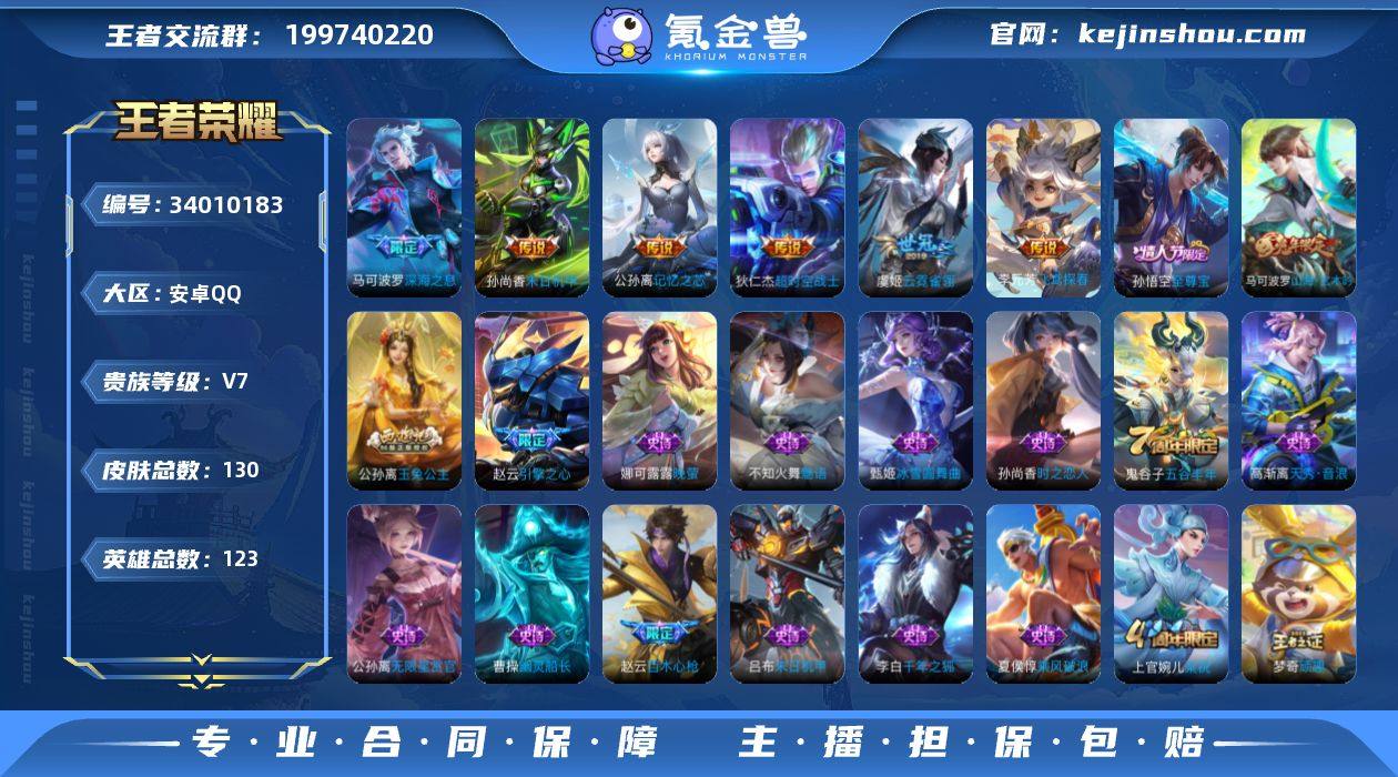 实名: 可修改 性别: 男号 贵族等级: V7 英雄数: 123 皮肤数: 130 传说皮: 云霓雀翎,末日机甲-孙尚香,飞鸢探春,超时空战士-狄仁杰,记忆之芯 限定皮: 梁祝,引擎之心,至尊宝,百木心枪,玉兔公主,深海之息,五谷丰年,山海·玄木吟 亮点: 【优质装备】:云霓雀翎,末日机甲-孙尚香(绿蚂蚱),飞鸢探春,超时空战士-狄仁杰,记忆之芯(机甲兔)