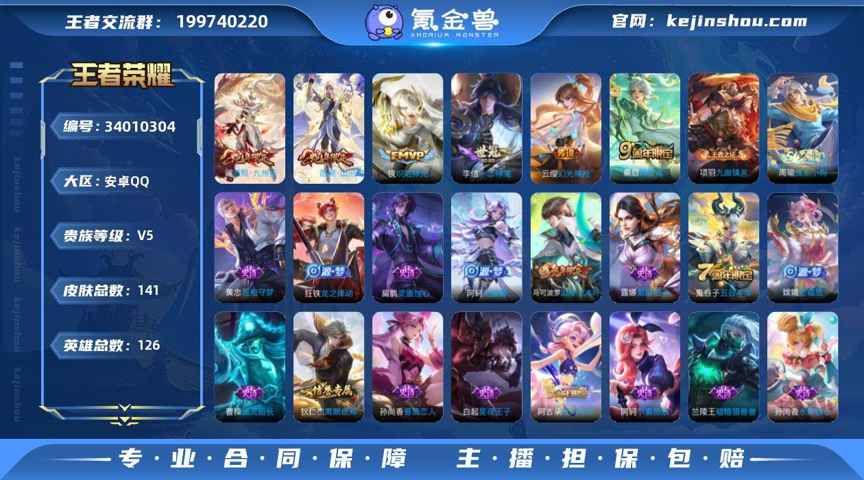 实名: 可修改 性别: 男号 贵族等级: V5 英雄数: 126 皮肤数: 141 传说皮: 炽阳神光,一念神魔,幻光神枪 限定皮: 五谷丰年,山海·玄木吟,鸣野蒿,愿照·山河定,愿照·九州拓 亮点: 【优质装备】:炽阳神光,一念神魔