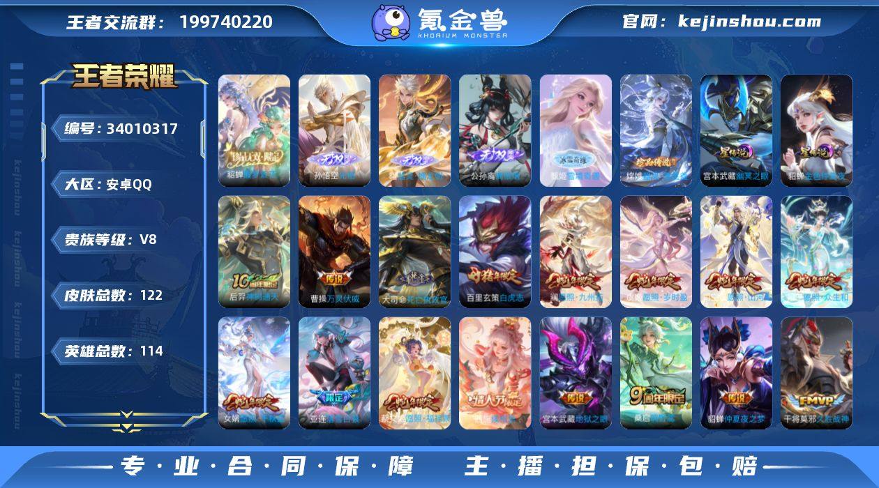 安卓Q-V8-至尊星耀V段位-114英雄-122皮肤-1珍品无双-5无双-2珍品传说-29传说-33史诗【英雄全皮】:孙权全皮,敖隐全皮,海诺全皮【珍品无双】:貂蝉馥梦繁花【无双皮肤】:李信问心剑,孙悟空无相,曜器灵螭龙剑,甄姬雪境奇遇,公孙离离恨烟【珍品传说】:伽罗沧流箭,嫦娥器灵落星盏【传说皮肤】:云缨神骥越千峰,关羽神骥镇沧海,朵莉亚神骥鸣幻洲,狄仁杰神骥赴朔漠,貂蝉神骥聚万邦,马超神骥逐星野,后羿神树通天,曹操万灵伏威,大司命死亡执政官,西施续相思,司空震愿照山河定,女娲愿照千秋盛,妲己愿照众生和,澜愿照九州拓,蔡文姬愿照福禄聚,虞姬愿照岁时盈,嬴政玄雷天君,桑启鸣野蒿,海月金乌负日,亚连落雪白狼,东皇太一灼幽烈阳,王昭君乞巧织情,李元芳飞鸢探春,虞姬启明星使,张良黄金白羊座,干将莫邪久胜战神,百里玄策白虎志,貂蝉仲夏夜之梦,宫本武藏地狱之眼【限定皮肤】:公孙离离恨烟,狄仁杰阴阳师,赵云皇家上将,元歌云间偶戏,元歌无心,狄仁杰魔术师,项羽海滩派对,虞姬启明星使,百里玄策白虎志,亚连落雪白狼,海月金乌负日,海诺心动手记【年限皮肤】:百里玄策白虎志,司空震愿照山河定,女娲愿照千秋盛,妲己愿照众生和,澜愿照九...