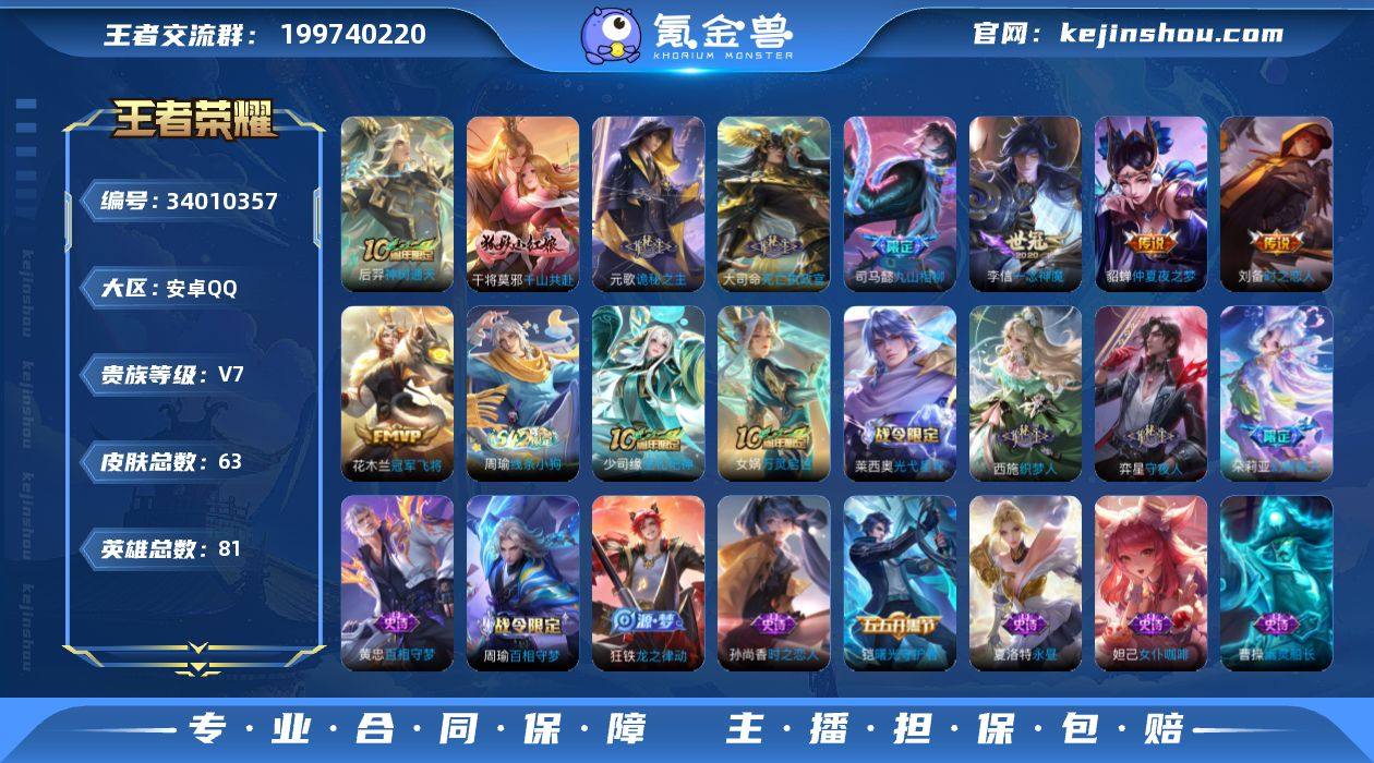 安卓Q-V7-尊贵铂金II段位-81英雄-63皮肤-10传说-25史诗【传说皮肤】:朵莉亚神骥鸣幻洲,后羿神树通天,干将莫邪千山共赴,元歌诡秘之主,大司命死亡执政官,司马懿九山相柳,李信一念神魔,刘备时之恋人,花木兰冠军飞将,貂蝉仲夏夜之梦【限定皮肤】:狄仁杰阴阳师,赵云皇家上将,狄仁杰魔术师,项羽海滩派对【赛季限定】:甄姬逆浪荇歌,亚瑟荣光之誓【战令限定】:周瑜百相守梦,孙策百相守梦,莱西奥光弋星穹,明世隐往忆晖光,周瑜线条小狗【史诗皮肤】:海月海之女神,明世隐百晓客,周瑜线条小狗,少司缘巫礼祀神,女娲万灵启世,莱西奥光弋星穹,弈星守夜人,西施织梦人,朵莉亚幻珠鲛人,黄忠百相守梦,周瑜百相守梦,狂铁龙之律动,夏洛特永昼,孙尚香时之恋人,狄仁杰鹰眼统帅,阿轲节奏热浪,白起星夜王子,铠曙光守护者,曹操幽灵船长,墨子金属风暴,妲己女仆咖啡,孙尚香水果甜心,宫本武藏鬼剑武藏,狄仁杰魔术师,王昭君偶像歌手,赵云皇家上将【其他皮肤】:影百相守梦,艾琳鹤鸣心笺,明世隐往忆晖光,亚瑟荣光之誓,鬼谷子克喵,莱西奥踏浪烽翎,庄周锦麟游梦,孙策百相守梦,云中君云械蓝图,甄姬逆浪荇歌,朵莉亚金色潮汐,姬小满零食大作战,盘古重...