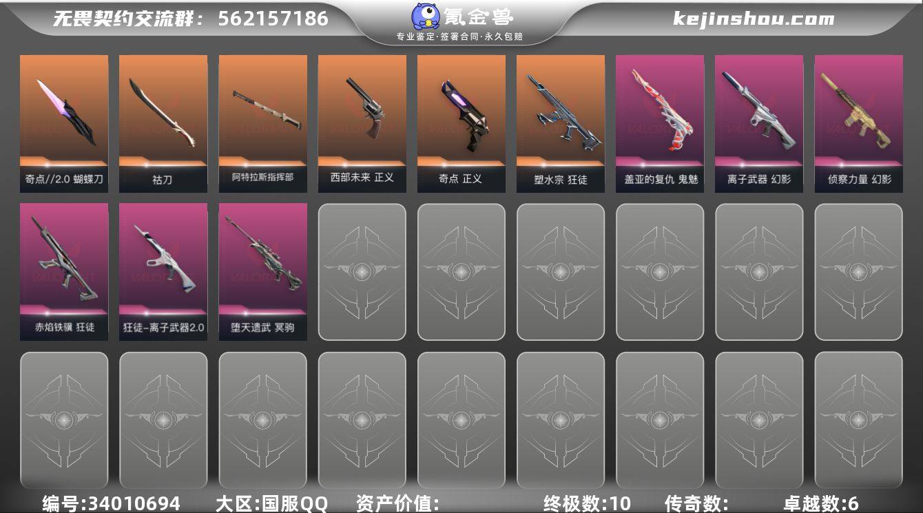 【英雄】:幻棱,炼狱,维斯,暮蝶,钛狐,壹决,捷风,雷兹,幽影,不死鸟,贤者,猎枭,零,芮娜,奇乐,尚勃勒,霓虹,斯凯,夜露,K/O,海神,盖可 【近战武器】:近战武器-奇点//2.0 蝴蝶刀,近战武器-紫金爪刀,近战武器-鬼丸国纲,近战武器-祜刀,近战武器-夜刃诡镰,近战武器-阿特拉斯指挥部 甩棍 【狂徒】:狂徒-塑水宗,狂徒-离子武器//2.0,狂徒-赤焰铁骥 【幻影】:幻影-离子武器,幻影-侦察力量 【冥驹】:冥驹-堕天遗武 【战神】:战神-星航勇进 【标配】:标配-樱花 【正义】:正义-奇点,正义-西部未来 【鬼魅】:鬼魅-盖亚的复仇 【卡面】:Clutch 卡面,无畏契约GO!第一卷:芮娜 卡面,无畏契约GO!第一卷:零 卡面,《双城之战》金克丝 卡面,代号红色 卡面,新兵报到 卡面,V契约 卡面,无畏契约 卡面 【喷漆】:审判之爪 喷漆,霓光四射 喷漆,买装还是存钱 喷漆,关门放狗 喷漆,无畏契约GO!第一卷:贤者 喷漆,胜利属于无畏契约 喷漆,GLHF 喷漆,无畏契约 喷漆 【挂饰】:无畏契约GO!第一卷 零 挂饰,瞬云履 挂饰,天外飞客 挂饰,无畏契约 纪念币 挂饰