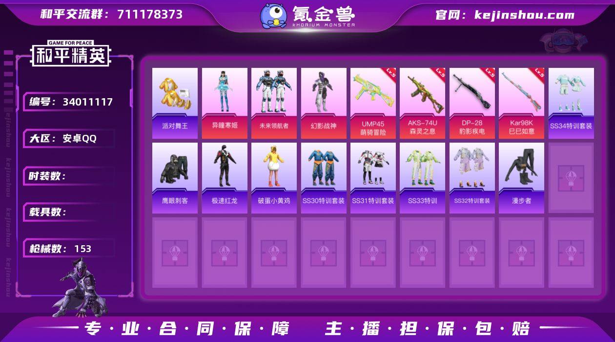 安卓Q 可二次 3粉装5特效枪135套装153枪皮 派对舞王 派对舞王(金靴子) 异瞳寒姬 未来领航者 幻影战神 AKS-74U-森灵之息(5级) Kar98K-巳巳如意(5级) DP-28-豹影疾电(5级) Mk14-福马献瑞(5级) UMP45-萌骑冒险(5级) 幻影战神背包 鹰眼刺客 漫步者 破蛋小黄鸡 极速红龙 M762-奇异狩猎者 和平精英账号