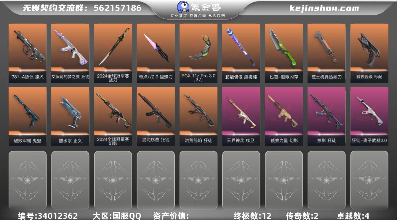 【套装】:2024全球冠军赛套装 【英雄】:幻棱,炼狱,维斯,暮蝶,钛狐,壹决,铁臂,捷风,雷兹,幽影,不死鸟,贤者,猎枭,蝰蛇,零,芮娜,奇乐,尚勃勒,霓虹,斯凯,夜露,星礈,K/O,海神,盖可,黑梦,钢锁 【近战武器】:近战武器-2024全球冠军赛 战刀,近战武器-奇点//2.0 蝴蝶刀,近战武器-RGX 11z Pro//3.0 爪刀,近战武器-超能偶像 应援棒,近战武器-超限闪存 匕首,近战武器-荒土机兵 热能刀 【狂徒】:狂徒-洪荒怒焰,狂徒-混沌序曲,狂徒-艾沃莉的梦之翼,狂徒-掠影,狂徒-离子武器//2.0,狂徒-超能偶像,狂徒-荒土机兵 【幻影】:幻影-2024全球冠军赛,幻影-侦察力量,幻影-超限闪存,幻影-聚合之力,幻影-纳米打击 【戍卫】:戍卫-天界神兵,戍卫-超能偶像,戍卫-浮光跃金,戍卫-逆冲蛮牛 【獠犬】:獠犬-781-A协议,獠犬-采蜜小蜂队,獠犬-模拟赫兹,獠犬-逆冲蛮牛 【冥驹】:冥驹-荒土机兵,冥驹-模拟赫兹 【飞将】:飞将-聚合之力 【莽侠】:莽侠-超限闪存 【战神】:战神-采蜜小蜂队,战神-浮光跃金 【奥丁】:奥丁-纳米打击 【判官】:判官-超能偶像,判官-采蜜小蜂队,判官-纳米打击x 【雄鹿】:雄鹿-模拟赫兹,雄鹿-逆冲蛮牛 【骇灵】:骇灵-荒土机...