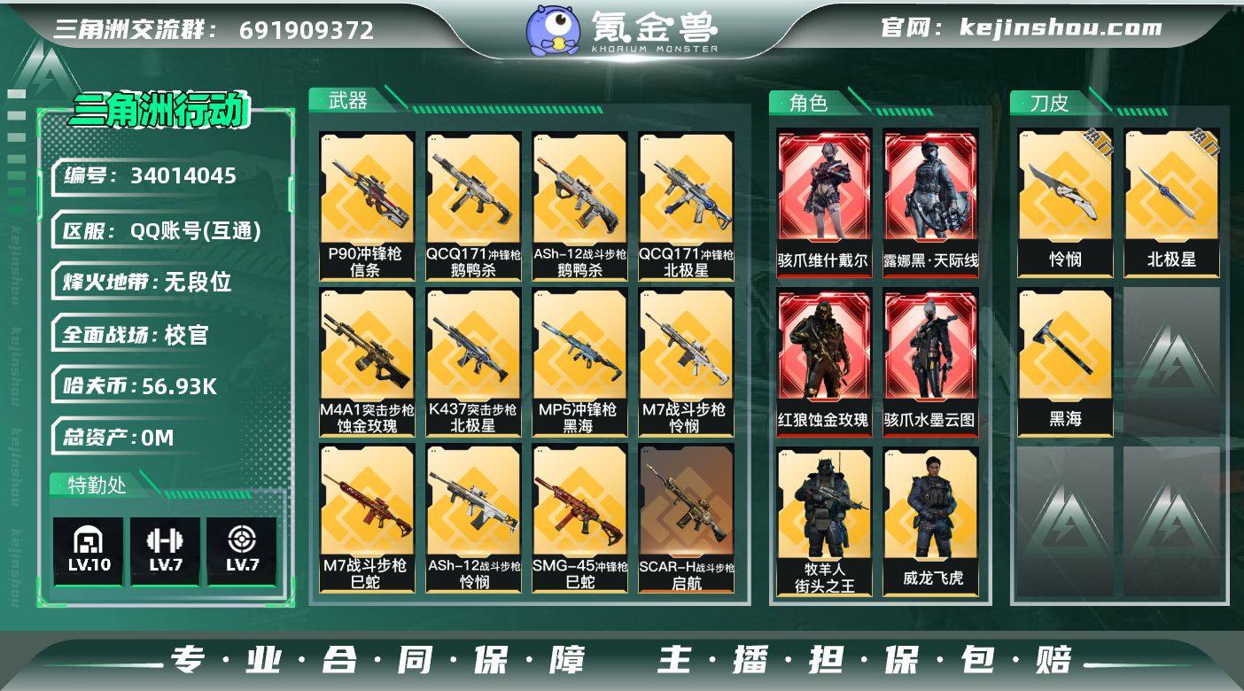 资产429M/哈夫币5693万/传说近战数1/传说枪皮数63/战场等级50/行动等级60/安全箱等时效性道具以游戏内数据为准,详情请看图/红狼-蚀金玫瑰/骇爪-水墨云图/露娜-黑·天际线/骇爪-维什戴尔/威龙-凌霄戍卫/威龙-壮志凌云S3/威龙-飞虎/蜂医-送葬人·无题密令(S5)/牧羊人-街头之王/无名-夜鹰S4/深蓝-不破誓约/红狼-电锯惊魂/露娜-金牌射手/乌鲁鲁-荒原猎手/蛊-不羁人生/近战-坠星者/近战-暗星/近战武器-北极星/近战-信条/近战-黑海/近战-怜悯/近战-处刑者1级/黑鹰/AS Val突击步枪-悬赏令/AS Val突击步枪-悬赏令(优品S)/M4A1突击步枪-蚀金玫瑰/M4A1突击步枪-阿米娅/AKM突击步枪-锦绣/QBZ95-1突击步枪-凌霄戍卫/ASh-12战斗步枪-怜悯/ASh-12战斗步枪-鹅鸭杀/K416突击步枪-行动记录/K416突击步枪-坠星者/AUG突击步枪-零重力/AUG突击步枪-西装暴徒/M7战斗步枪-怜悯/M7战斗步枪-维京/M7战斗步枪-巳蛇/SG552突击步枪-运动员/AK-12突击步枪-夜鹰/AK-12突击步枪-特斯拉线圈/SCAR-H战斗步枪-铁艺苍穹/SCAR-H战斗步枪-水墨云图/SCAR-H战斗步枪-启航/SCAR-H战斗步枪-荼蘼/G3战斗步枪-骑士/CAR-15突击步枪-阿米娅/腾龙突击步枪-捞点薯条/腾龙突击步枪-马年祥瑞/腾龙突击步枪-万金泪冠/K437突击步枪...