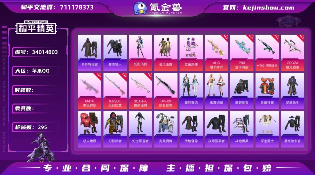 地铁天赋】c31244-【无二次协助处理】【因赛季更新游戏段付以上号为准!】 苹果Q-2稀有3粉装9特效枪21热门233套装295枪皮 19印记 历史传奇王牌13星 【2稀有】 奇异狩猎者 都市猎人 【3粉装】 金风玉露 幻影飞狐 蓝莓炮弹 【9特效枪】 SCAR-L-锦绣绵绵 (5级) M416-电玩时刻 (5级) P90-金丰海韵 (7级) Kar98K-巳巳如意 (5级) M762-青锋波束 (5级) DP-28-豹影疾电 (5级) AUG-暖羊咩咩 (5级) GROZA-镜光银凌 (5级) Mk14-福马献瑞 (5级) 【21热门】 小丑鱼 龟仙人 暗夜之虎 雪山精英 梦魇先生 呆萌铁蟹 鹰眼刺客 暗夜之虎 赛罗奥特曼 团圆交子 瑞龙福将 水银刺客 漫步者 机械英豪 破蛋小黄鸡 风华少年志 白月香洋装 新侠客行 极速红龙 M762-瑞龙福将 M249-古堡领主 【1飞行器】 齐天大圣飞行器 【1头盔】 深海小丑鱼头盔 【2背包】 九霄背包 神秘黑猫背包