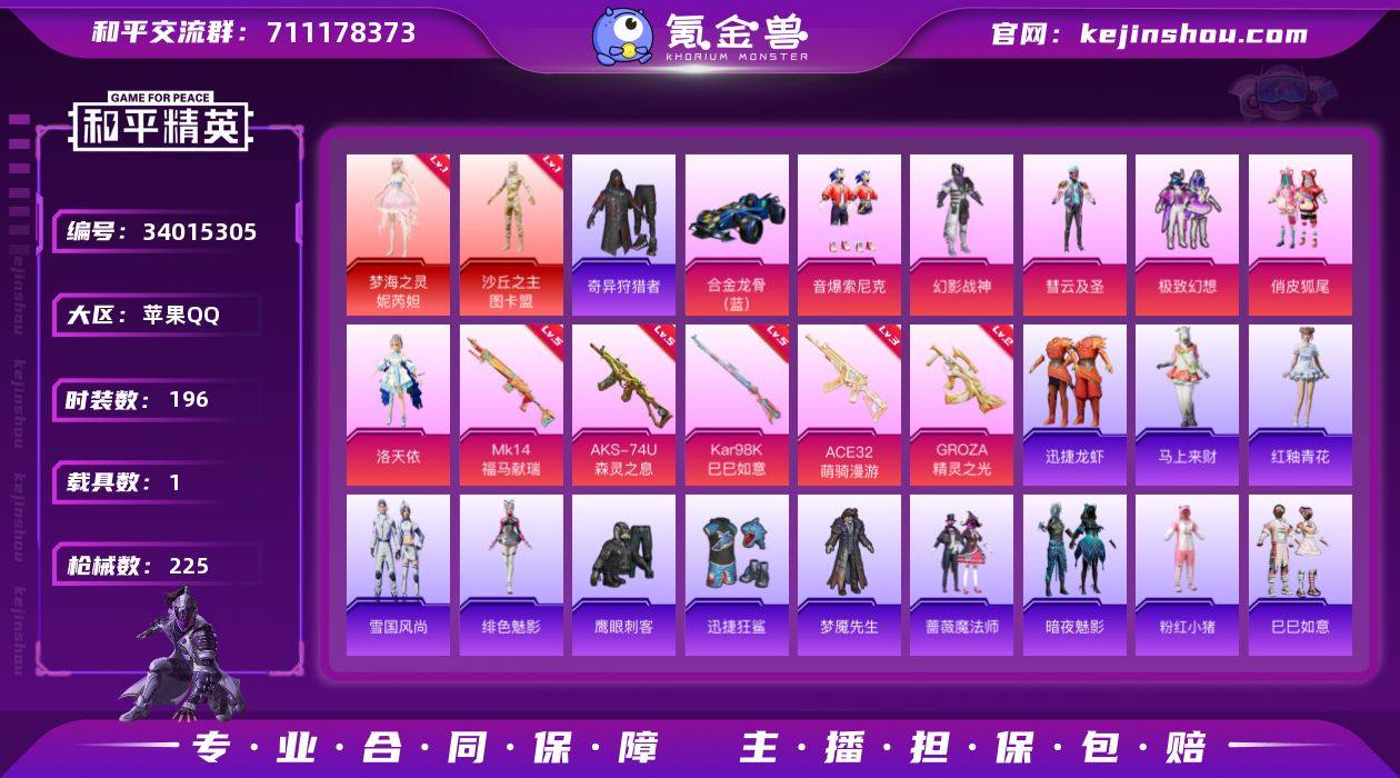 196套装/枪械5/装备252/载具1/战备156/王牌印记7/热力值74102/二级GROZA-精灵之光/三级ACE32-萌骑漫游/五级AKS-74U-森灵之息/五级Kar98K-巳巳如意/五级MK14-福马献瑞/一级梦海之灵-妮芮妲/一级沙丘之主-图卡盟/梦海之灵-妮芮妲/沙丘之主-图卡盟/音爆索尼克/奇异狩猎者/旭日初心兜帽大衣/粉红小猪/幻影战神/彗云及圣/极致幻想/俏皮狐尾/洛天依/合金龙骨(蓝)/GROZA-精灵之光/ACE32-萌骑漫游/AKS-74U-森灵之息/Kar98K-巳巳如意/MK14-福马献瑞/炫彩糖果飞行器/飞行器-春暖花开/飞行器-精灵迷巫/沙丘之主天马飞行器/曦光华影飞行器/极意拳锋飞行器/踏卷乘风飞行器/精灵迷巫降落伞/星之信仰降落伞/阿狸红降落伞/烈焰拳霸降落伞/古战神甲降落伞/暗夜玫瑰降落伞/洛神天依降落伞/千金淑猫降落伞/绯穹魔姬降落伞/异瞳寒姬降落伞/炫彩糖果降落伞/灵驹仙姬降落伞/巳巳如意/雪国风尚/炫彩糖果/马上来财/迅捷龙虾/绯色魅影/雨过天青/红釉青花/AUG-冰晶雪宝/AKM-夜灯/AKM-彩虹符号/AKM-星之信仰/AKM-灼热熔岩/AKM-生命誓言/AKM-破晓战魂/AKM-萌趣颜团子/AKM-虎虎生威/AKM-霓虹街区/AKM-龙的传人/M16A4-幻世战舞者/M16A4-甜心亚梦/M16A4-红色方程式/M16A4-蓝色火焰/M16A4-魔法学院/SCAR-L-夜...