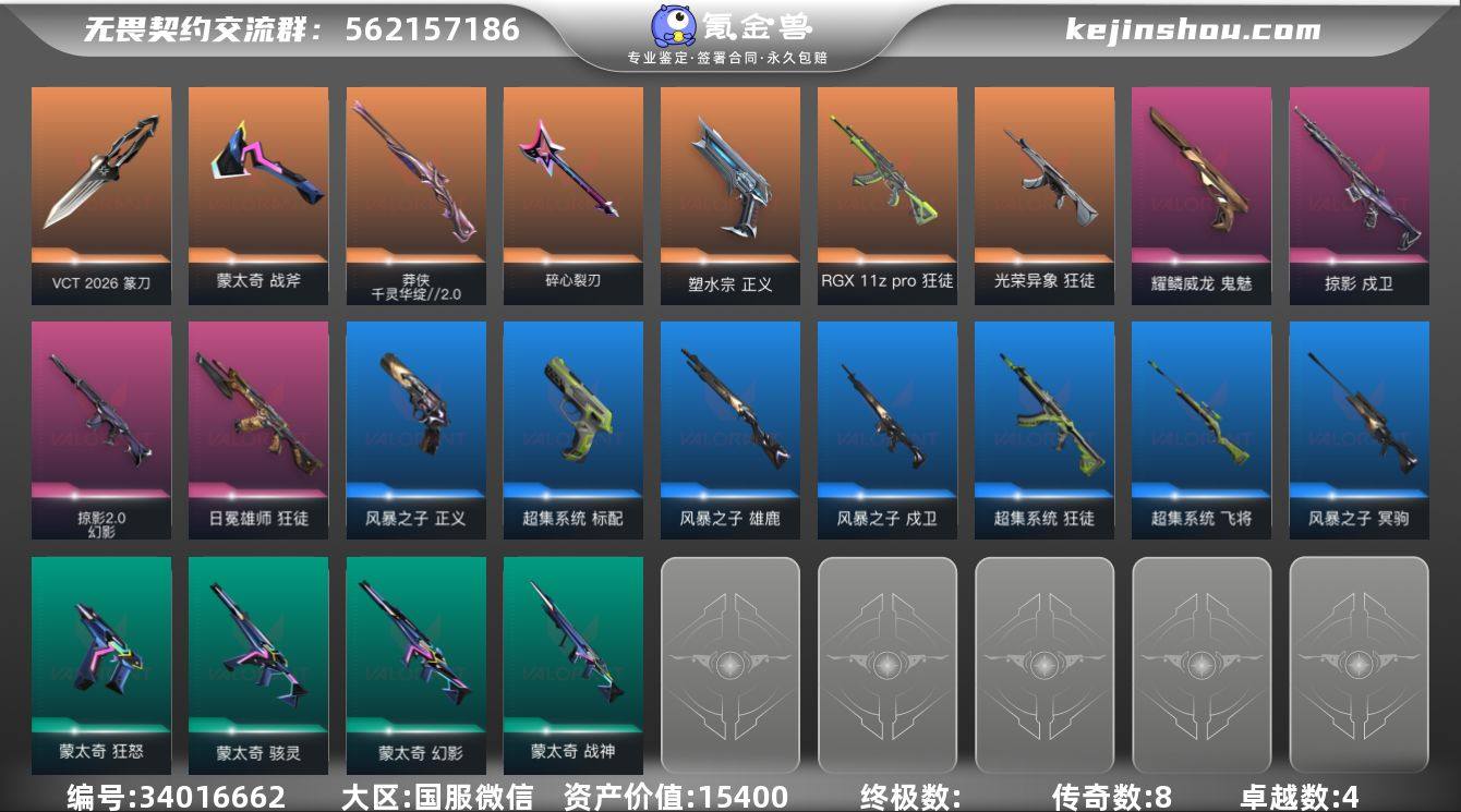 段位: 白银 近战武器皮肤: 碎心裂刃,蒙太奇 战斧,VCT 2026 篆刀 步枪皮肤: 狂徒-日冕雄师,戍卫-掠影,狂徒-RGX 11z pro,狂徒-光荣异象,幻影-掠影2.0,超集系统 狂徒,蒙太奇 幻影,风暴之子 戍卫 佩枪皮肤: 正义-塑水宗,鬼魅-耀鳞威龙,超集系统 标配,风暴之子 正义,蒙太奇 狂怒 狙击枪皮肤: 莽侠-千灵华绽//2.0,风暴之子 冥驹,超集系统 飞将 冲锋枪皮肤: 蒙太奇 骇灵 霰弹枪皮肤: 风暴之子 雄鹿 机枪皮肤: 蒙太奇 战神 亮点: 【优质装备】:正义-塑水宗,狂徒-日冕雄师,狂徒-RGX 11z pro,戍卫-掠影,鬼魅-耀鳞威龙