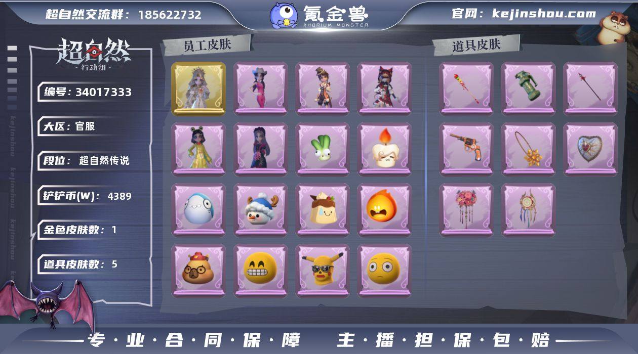 ZRX1097,金皮:1,紫皮:5,道具皮:10,外观:薇薇安-圣光之谕,爱丽丝-丝缕哀歌,莉莉-莓果陷阱,爱丽丝-耀眼的你,阿念-庆宴绮愿,小黄-呱呱雨衣,道具:闪光弹-金戈玄铜,转轮手枪-新星时代,急救包-蔷薇物语,音响-鸣沙鼓,长枪-糖葫芦霸王枪,摸金符-花落精绝,长枪-罪棘,额外的背包-飞花令,喷气背包-乘风溯雪,腰包-宝剑八,饰品:头饰-火爆了头套,头饰-蒜了八,头饰-惊魂南瓜头套,头饰-烛光纪念,头饰-卑微头套,头饰-鱼头怪头套,头饰-滑稽头套,头饰-哈士奇头套,头饰-大葱明头套,头饰-萨卡班甲鱼头套,头饰-炙热烧烤,头饰-雪墩墩头套,头饰-呆滞头套,头饰-嘻嘻头套,头饰-面具马头套,头饰-太空鲨头套,头饰-小财神豚豚头套,头饰-烈焰红唇头套,头饰-樱桃奶油布丁,头饰-后室幸存者头套,头饰-像素朋克墨镜,挂饰-天使消失的年代,挂饰-钗头凤,挂饰-未竟乐园,背饰-天使的呼唤,背饰-潮汐小海兔,背饰-牛啤背包,动作:动作-舞台中心,动作-九万字舞,动作-luvaboy,动作-新年摇,动作-带你逃跑吧,动作-举牌,动作-拜年,动作-要糖,动作-抬手,工牌背景:工牌背景-卷珠帘,工牌背景-圣光之誓,工牌动作:工牌动作-虔诚之姿,员工:小满,员工-月,员工-艾伦,员工-爱德华,员工-莉莉,员工-小黄,员工-逍遥,员工-薇薇安,员工-兰,员...