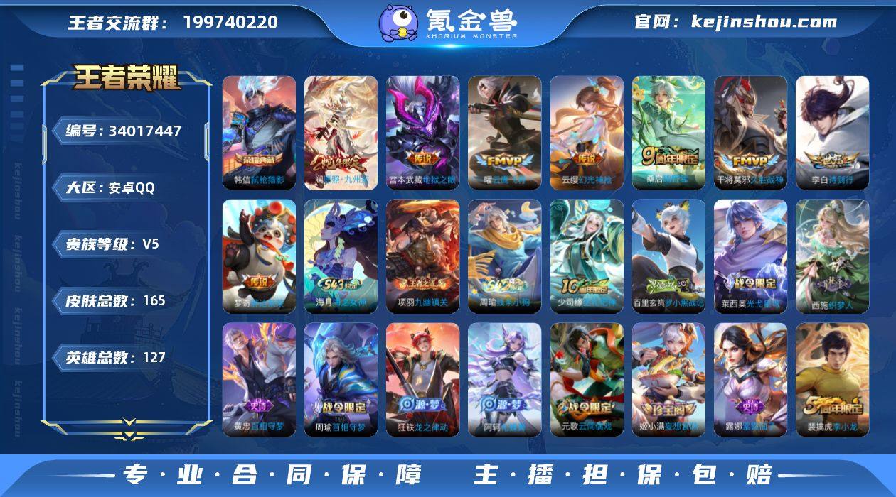 实名: 可修改 性别: 男号 贵族等级: V5 英雄数: 127 皮肤数: 165 荣耀水晶: 弑枪猎影 传说皮: 云鹰飞将,久胜战神,地狱之眼,胖达荣荣,幻光神枪 限定皮: 李小龙,诗剑行,鸣野蒿,愿照·九州拓 亮点: 【优质装备】:弑枪猎影(韩信典藏),云鹰飞将(小将军),久胜战神,地狱之眼,胖达荣荣