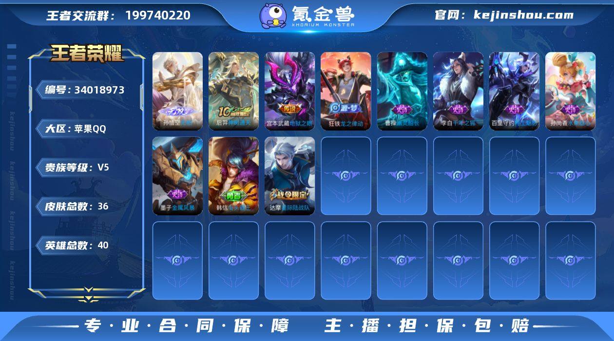 HXX2137孙悟空无相-孙权全皮-苹果Q-V5-至尊星耀II段位-40英雄-36皮肤-1无双-2传说-11史诗