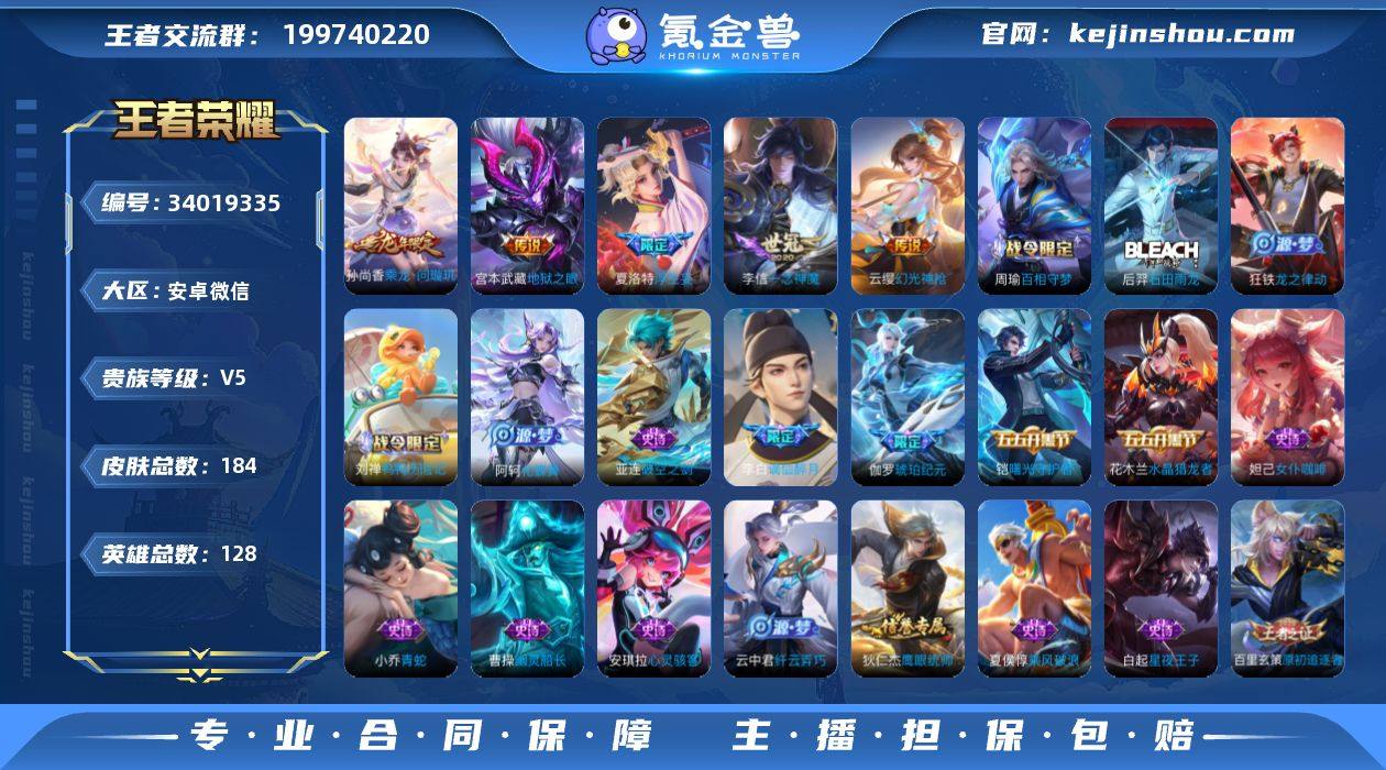 V5 1珍品传说 9传说 128英雄 184皮肤 可二次 可修改实名 男号 【英雄全皮】敖隐全皮,空空儿全皮,孙权全皮,蚩奼全皮,大禹全皮 【稀有英雄】敖隐(小龙人),大司命,韩信(韩跳跳),夏洛特(夏师傅),艾琳,橘右京(橘子),娜可露露(鸟人),不知火舞,赵云,金蝉(唐僧),戈娅 【珍品传说】怪盗基德 【传说皮】幻光神枪,乘龙·问璇玑(孙尚香年限),神树通天,地狱之眼,一念神魔,浮生妄,澜逐花归海 【珍宝阁皮】妄想食味 【赛季/战令皮】噬灭天穹(s37),古海寻踪(s33),探海日志(s32),顽趣-梦奇,地狱燃心,剑破天穹(s35),天穹祈灯(s34),青焰无极,苍威无极,天穹之誓(s36),蔡文姬夏日便利店,虞姬夏日便利店,神迹守卫-钟馗 【史诗皮】谪仙醉月,星界战将,茶境仙,化蝶舞,破空之剑,琥珀纪元伽罗,蒙犽顽岩魄,鸭鸭历险记-刘禅,龙之律动,海之女神,线条小狗-周瑜,九幽镇关,万灵启世,百相守梦-周瑜,涂山容容,石田雨龙,百相守梦-黄忠,百解令(蒙犽),江河有灵,冰冠公主,青蛇,偶像歌手,猫狗日记-孙策,节奏热浪,女仆咖啡,摇滚巨星,水果甜心,星夜王子,心灵骇客,德古拉伯爵,暗隐猎兽者,幽灵船长,鬼剑武藏,舞动绿茵,纤云弄巧,乘风破浪,逐浪之夏,水晶猎龙者,曙光守护者,原初追逐者,圣诞恋歌,鹰眼统帅,无心,未来纪元-赵云...
