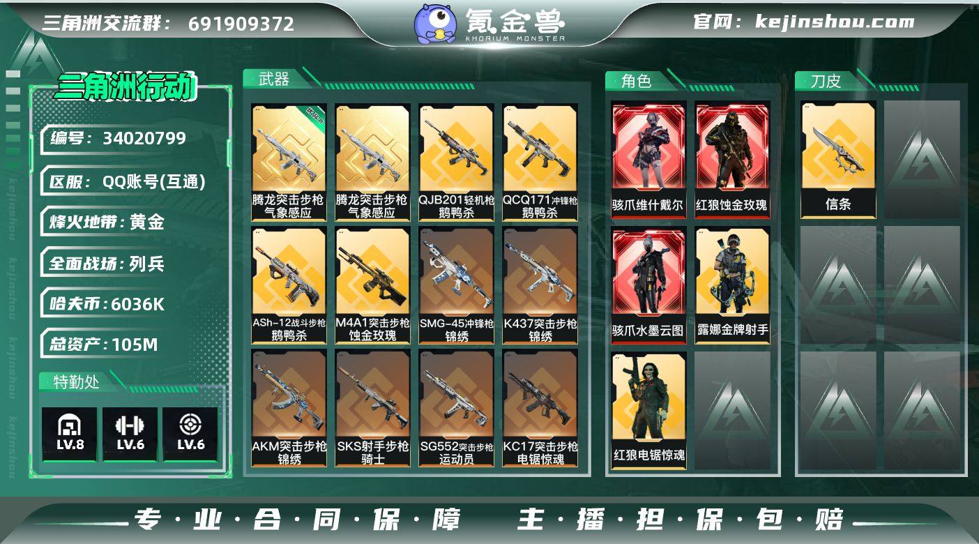 【LSJX1080】105m总资产-6036k哈夫币-60烽火等级-黄金-13战场等级-列兵 【干员外观】:红狼-蚀金玫瑰,骇爪-水墨云图,骇爪-维什戴尔,红狼-电锯惊魂,露娜-金牌射手 【近战皮肤】:近战-信条,近战-黑鹰 【典藏外观】:腾龙突击步枪-气象感应 【典藏外观成色】:腾龙突击步枪-气象感应(优品A) 【传说外观】:M4A1突击步枪-蚀金玫瑰,M4A1突击步枪-阿米娅,AKM突击步枪-锦绣,ASh-12战斗步枪-鹅鸭杀,SG552突击步枪-运动员,SCAR-H战斗步枪-水墨云图,SCAR-H战斗步枪-启航,G3战斗步枪-骑士,CAR-15突击步枪-阿米娅,K437突击步枪-锦绣,KC17突击步枪-电锯惊魂,SMG-45冲锋枪-锦绣,QCQ171冲锋枪-鹅鸭杀,M250通用机枪-骑士之心,QJB201轻机枪-鹅鸭杀,SKS射手步枪-骑士,R93狙击步枪-维什戴尔 【史诗外观】:AKM突击步枪-逆战未来,ASh-12战斗步枪-无极限,K416突击步枪-冬日风情,AUG突击步枪-蝮蛇,M7战斗步枪-百步穿杨,G3战斗步枪-流沙送葬,AS Val突击步枪-百步穿杨,腾龙突击步枪-猎鳄行动,K437突击步枪-守护者,MP5冲锋枪-战术竞备,MP5冲锋枪-竞技风,Vector冲锋枪-百步穿杨,SR-3M紧凑突击步枪-战术竞备,勇士冲锋枪-工业狂潮,MP7冲锋枪-守护者,MP7冲锋枪-六套之...
