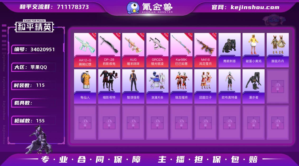【1粉装】角色-萨利娅【7特效枪】DP-28-豹影疾电[5级],AA12-G-萌骑幻想[5级],M416-风花雪月[7级],Kar98K-巳巳如意[5级],AUG-暖羊咩咩[5级],Mk14-福马献瑞[5级],GROZA-镜光银凌[5级]【2稀有】暗影哥特,浪漫天命【5飞行器】登顶巅峰飞行器,狂鲨锋刃飞行器,异域银装飞行器,破刃行动尾迹,马上有福飞行器【260其它衣服和枪皮】角色-摩登魅猫,猛禽,遗迹猎人,异域银装,破蛋小黄鸡,SS20特训,SS36特训,SS22特训,鹰眼刺客,狂鲨锋刃,角色-欧布奥特曼,黄色伏地魔,龙魂突击队,星影赞美诗,SS8特训,瑞龙福将,黑色伏地魔,绯格组合,巳巳如意,SS24特训,黄色运动,SS17特训,SS19特训,SS16特训,缤纷果语,玉兔迎春,福星高照,大橘大利,SS34特训,魅力单车,冰冻风暴,蝶变,夏日倾情,冰川特警,鹤鸣,SS35特训,空岛之星,虎虎生威吉莉,无暇誓言,SS31特训,燕燕于飞,海盐绵绵冰,时空追击者,角色-紫俏灵猫,暴风机械师,长空猛禽,角色-赛罗奥特曼,霓虹极客,SS33特训,特种颜团子,SS23特训,街头潮人,顶瓜瓜,SS26特训,狙击之神,元气之梦,SS...