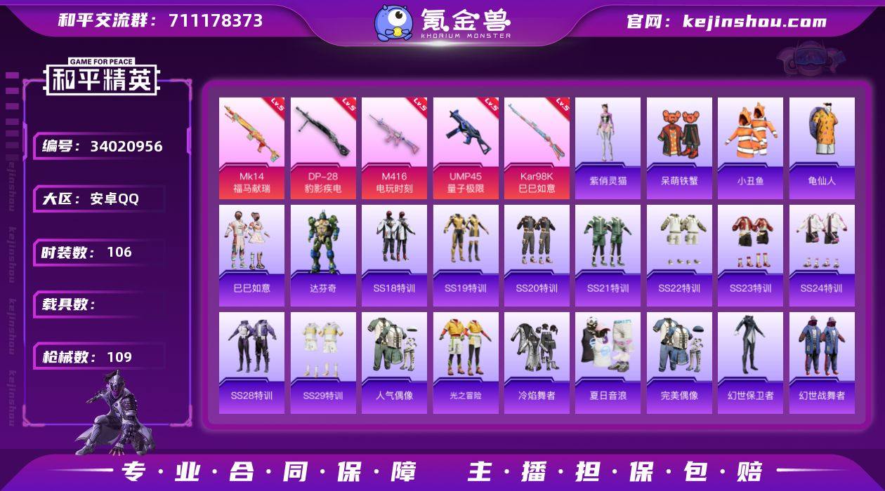 【FK6988】106套装/枪械5/装备116/战备76/王牌印记2/热力值30782/五级M416-电玩时刻/五级UMP45-量子极限/五级Kar98K-巳巳如意/五级MK14-福马献瑞/五级DP-28-豹影疾电/小丑鱼/龟仙人/M416电玩时刻/UMP45量子极限/Kar98K-巳巳如意/MK14-福马献瑞/DP-28-豹影疾电/彩虹甜喵降落伞/炫彩糖果降落伞/巳巳如意/达芬奇/紫俏灵猫/AKM-彩虹符号/AKM-灼热熔岩/AKM-破晓战魂/M16A4-幻世战舞者/M16A4-甜心亚梦/SCAR-L-炫彩节奏/SCAR-L-玉兔迎春/SCAR-L-红色方程式/M416-暗夜行者/M416-糯团青竹/M416-红色方程式/M416-蓝色火焰/GROZA-异彩先驱/GROZA-影袭/GROZA-田园牧歌/AUG-天降萌叽/AUG-耀粉歌者/QBZ-神秘黑猫/QBZ-飞驰魅影/M762-天降萌叽/AC-VAL-天降萌叽/AC-VAL-甜心亚梦/蜜獾-天降萌叽/蜜獾-娇憨猪猪/UZI-啾咪啾咪/UZI-天降萌叽/UZI-娇憨猪猪/UZI-幻影战神/UMP45-蓝色火焰/Vector-彩虹符号/Vector-田园牧歌/汤姆逊-异彩先驱/MP5K-异彩先驱/P90-筑梦精灵/P90-飞驰魅影/P90-巳巳如意/Kar98K-飞驰魅影/M24-炫彩节奏/SKS-炫彩节奏/VSS-田园牧歌/Mini14-异彩先驱/Mini14-炫彩节奏/Mini14-耀粉歌者/SLR-娇憨猪猪/S686-未来战士/S686-巳巳如意/S1897-炫彩节奏/S1897-飞驰魅影/S12K-娇憨猪猪/DB...