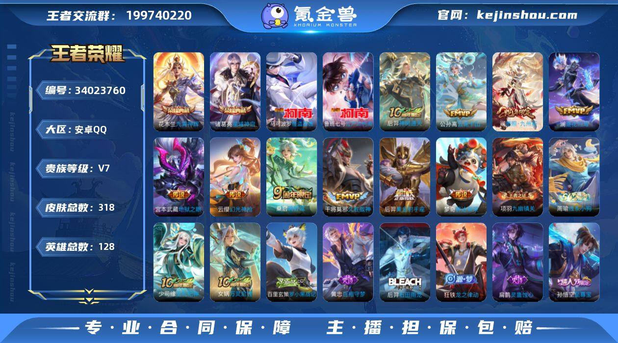 实名: 可修改 性别: 男号 贵族等级: V7 英雄数: 128 皮肤数: 318 荣耀水晶: 星域神启,九霄神辉 珍品传说: 江户川柯南,怪盗基德 传说皮: 黄金射手座,久胜战神,地狱之眼,胖达荣荣,澜逐花归海,幻光神枪,云诺千山,神树通天 限定皮: 遇见飞天,李小龙,游园惊梦,梁祝,神威,至尊宝,高山流水,孙行者,傲雪梅枪,五谷丰年,鸣野蒿,逐霄战戟,愿照·九州拓 亮点: 【优质装备】:星域神启(倪克斯贼亮),九霄神辉(木兰典藏),江户川柯南,怪盗基德,黄金射手座,久胜战神,地狱之眼,胖达荣荣,澜逐花归海