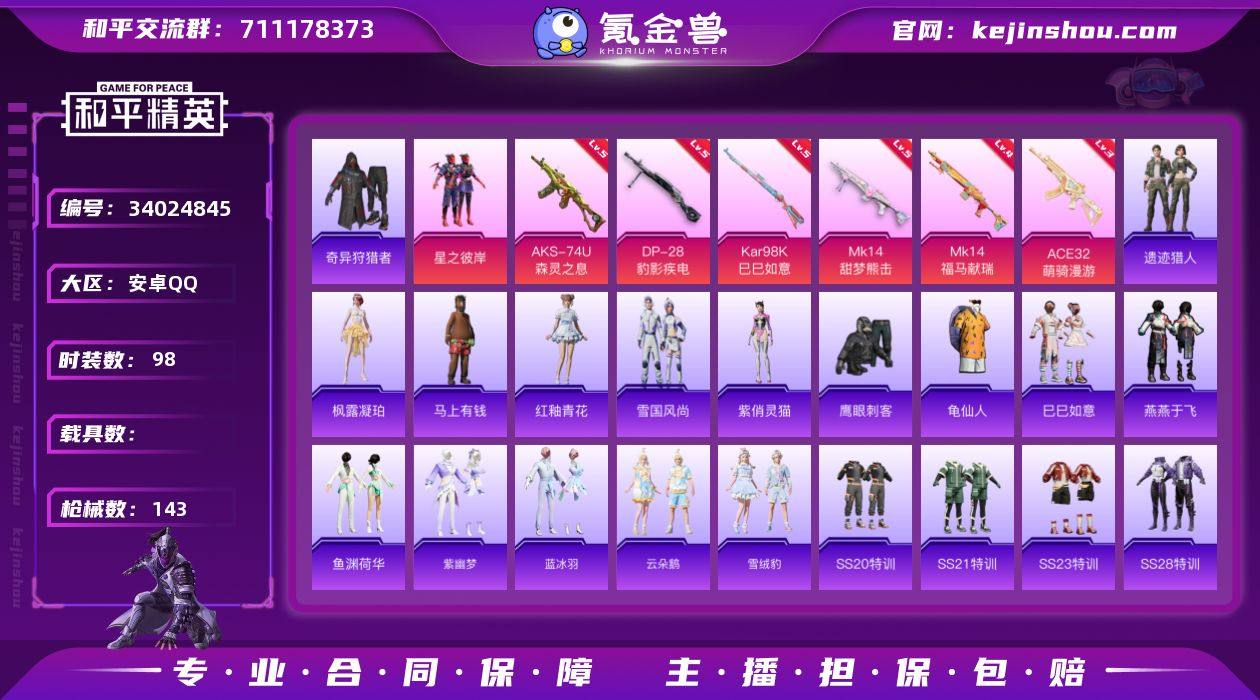 【HPN2354】98套装/枪械6/装备155/战备91/王牌印记4/热力值37435/三级ACE32-萌骑漫游/五级AKS-74U-森灵之息/五级Kar98K-巳巳如意/五级MK14-甜梦熊击/四级MK14-福马献瑞/五级DP-28-豹影疾电/奇异狩猎者/龟仙人/星之彼岸/ACE32-萌骑漫游/AKS-74U-森灵之息/Kar98K-巳巳如意/MK14-甜梦熊击/MK14-福马献瑞/DP-28-豹影疾电/炫彩糖果飞行器/星之彼岸降落伞/洛神天依降落伞/幻彩电音降落伞/异瞳寒姬降落伞/炫彩糖果降落伞/巳巳如意/雪国风尚/炫彩糖果/马上有钱/遗迹猎人/燕燕于飞/鱼渊荷华/紫幽梦/蓝冰羽/云朵鹅/雪绒豹/紫俏灵猫/雨过天青/红釉青花/枫露凝珀/AUG-冰晶雪宝/AKM-破晓战魂/AKM-龙的传人/SCAR-L-炫彩节奏/SCAR-L-玉兔迎春/SCAR-L-红色方程式/M416-糯团青竹/M416-蓝色火焰/GROZA-田园牧歌/AUG-耀粉歌者/M762-天降萌叽/M762-奇异狩猎者/M762-彩虹符号/M762-云朵鹅/AC-VAL-天降萌叽/蜜獾-天降萌叽/UZI-啾咪啾咪/UZI-红色方程式/UMP45-蓝色火焰/Vector-生命誓言/汤姆逊-天降萌叽/汤姆逊-奇异狩猎者/MP5K-飒粉甜心/P90-巳巳如意/Kar98K-彩虹符号/Kar98K-红色方程式/M24-幻彩电音/SKS-炫彩节奏/SKS-糯团青竹/VSS-彩虹符号/VSS-星之彼岸/Mini14-炫彩节奏/SVD-云朵鹅/S686-红色方...