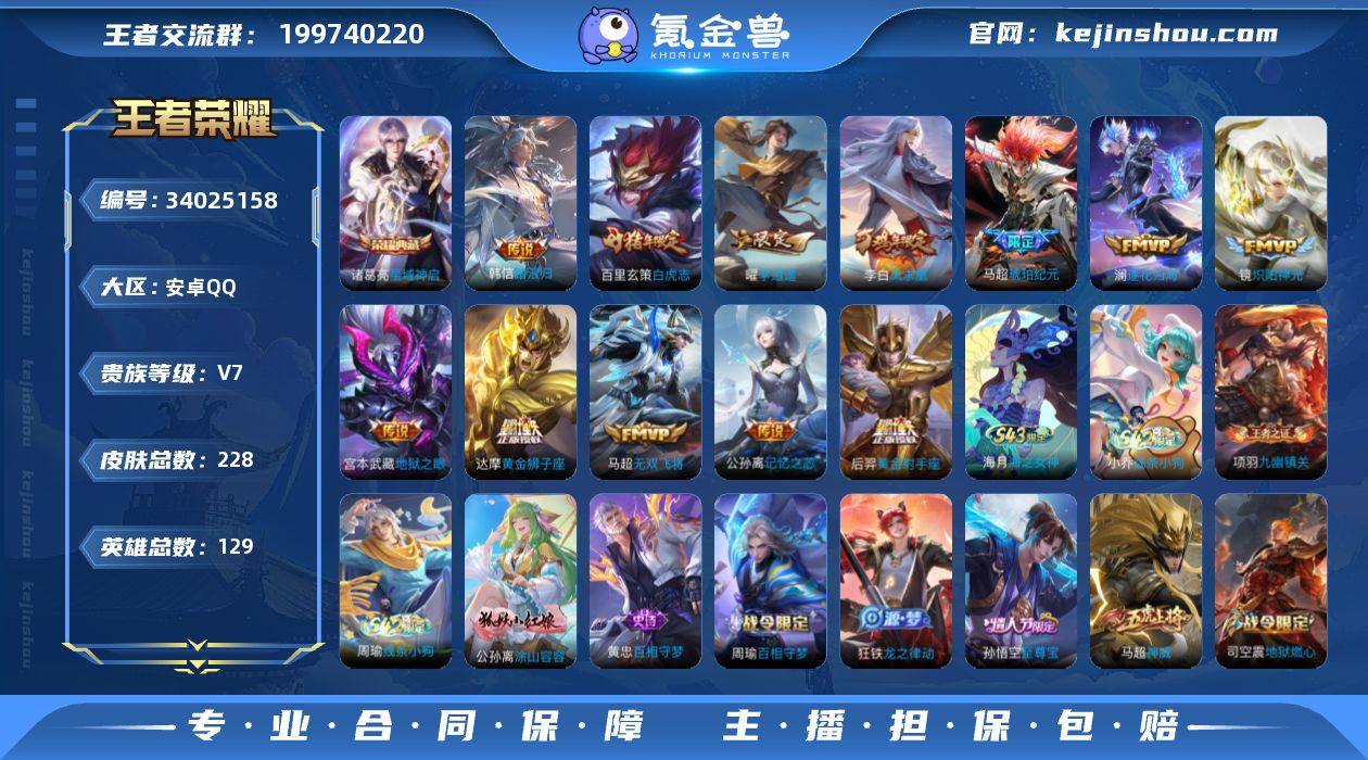 实名: 可修改 性别: 男号 贵族等级: V7 英雄数: 129 皮肤数: 228 荣耀水晶: 星域神启 传说皮: 黄金狮子座,黄金射手座,炽阳神光,地狱之眼,李逍遥,无双飞将,记忆之芯,澜逐花归海,琥珀纪元马超,踏浪归 限定皮: 李小龙,神威,天狼征服者,凤求凰,美猴王,白虎志,至尊宝,大圣娶亲 亮点: 【优质装备】:星域神启(倪克斯贼亮),黄金狮子座,黄金射手座,炽阳神光,地狱之眼,李逍遥,无双飞将,记忆之芯(机甲兔),澜逐花归海,琥珀纪元马超,涂山容容