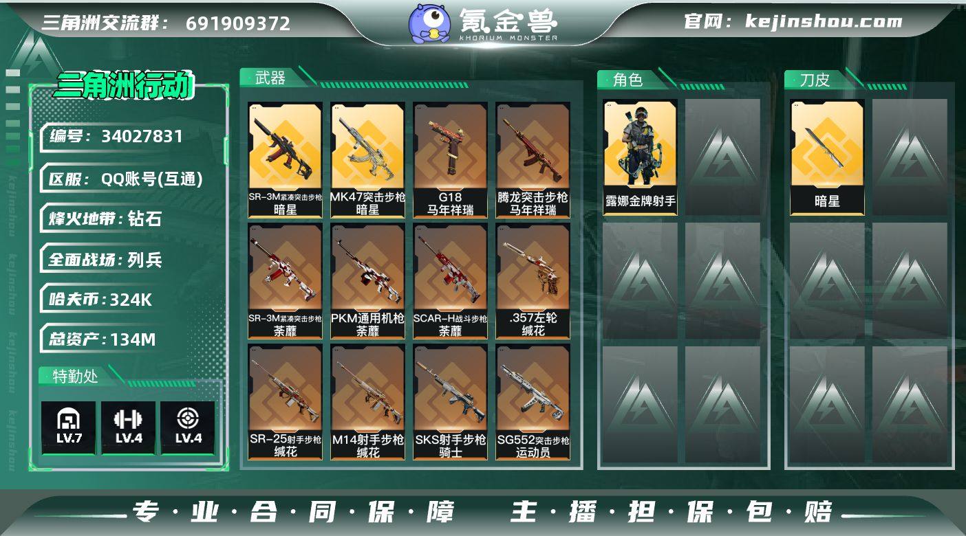 【PTSJZ3520】总资产134M/哈夫币32万/传说近战数1/传说枪皮数13/战场等级11/行动等级60/安全箱等时效性道具以游戏内数据为准,详情请看图/露娜-金牌射手(S7)/近战-暗星/近战-黑鹰/SG552突击步枪-运动员/SCAR-H战斗步枪-荼蘼/腾龙突击步枪-马年祥瑞/MK47突击步枪-暗星/SR-3M紧凑突击步枪-暗星/SR-3M紧凑突击步枪-荼蘼/PKM通用机枪-荼蘼/M14射手步枪-蛮荒/M14射手步枪-缄花/SKS射手步枪-骑士/SR-25射手步枪-缄花/.357左轮-缄花/G18-马年祥瑞/K416突击步枪-冬日风情/K416突击步枪-腊梅/K416突击步枪-阿萨拉特攻/M7战斗步枪-百步穿杨/SG552突击步枪-哈夫克警备/G3战斗步枪-流沙送葬/AS Val突击步枪-百步穿杨/K437突击步枪-丛林谍踪/Vector冲锋枪-百步穿杨/Vector冲锋枪-异域战争/SR-3M紧凑突击步枪-开工大吉/勇士冲锋枪-深海恐惧/勇士冲锋枪-丛林谍踪/MP7冲锋枪-六套之力/M249轻机枪-丛林谍踪/QJB201轻机枪-炽焰/VSS射手步枪-丛林谍踪/SVD狙击步枪-阿萨拉工艺/M14射手步枪-工业狂潮/M14射手步枪-航天庆典/M700狙击步枪-百步穿杨/AWM狙击步枪-流沙送葬/M14射手步枪-巨兽/M4A1突击步枪-繁盛/ASh-12战斗步枪-繁盛/K416突击步枪-一帆风顺/SG552突击步枪-2026/SG552突击步枪-马年新春/S...