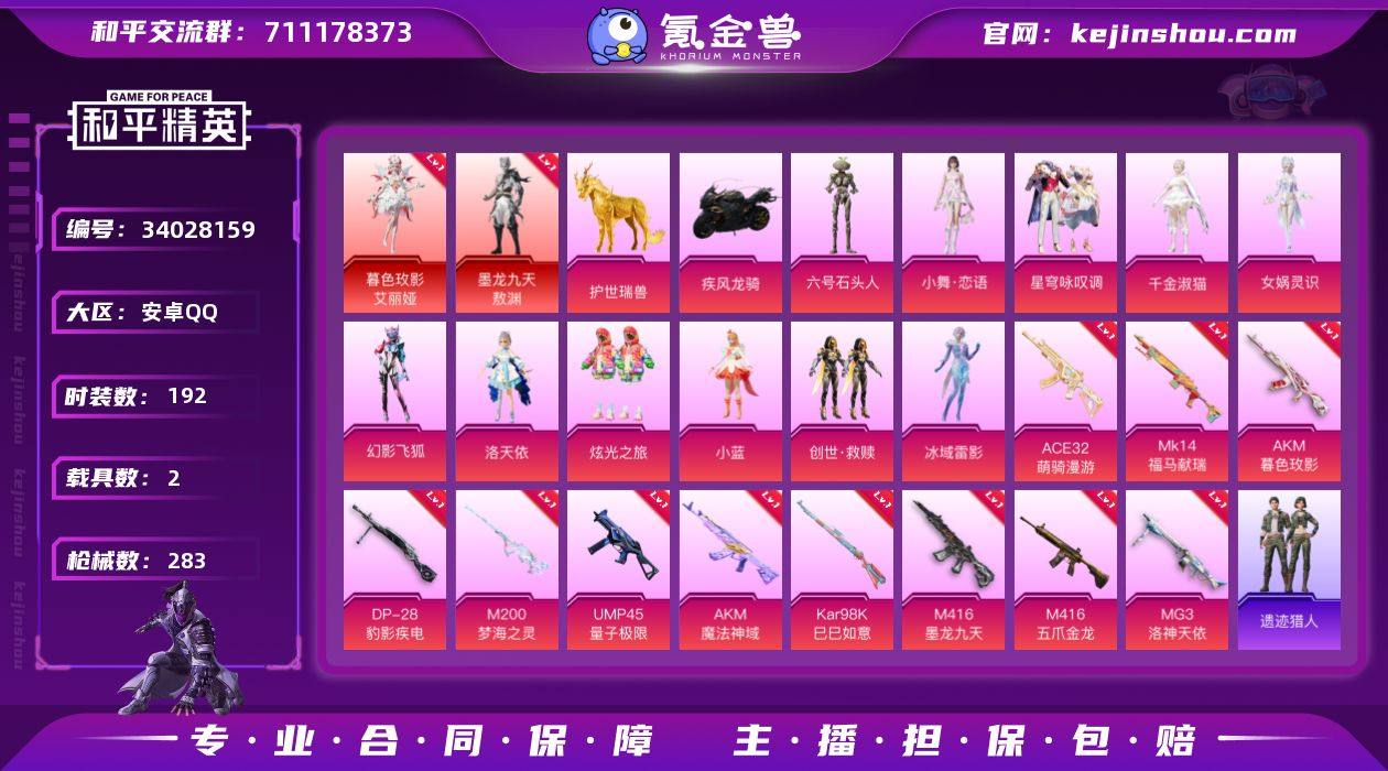 【2红装1个4级11粉装11特效枪2载具 秒换绑不用等】 安卓Q区-91361热力值-192套装-283枪皮 【2红装】 墨龙九天-敖渊(1级) 暮色玫影-艾丽娅(4级)【2载具】 护世瑞兽 疾风龙骑【2稀有】 Mark.06蓝螳螂 8号机粉螳螂【11粉装】 洛天依 人物-小舞·恋语 六号石头人 炫光之旅 创世·救赎 角色-冰域雷影 角色-小蓝 星穹咏叹调 角色-女娲灵识 幻影飞狐 角色-千金淑猫【11特效枪】 M416-墨龙九天(3级) M200-梦海之灵(3级) AKM-魔法神域(3级) M416-五爪金龙(7级) AKM-暮色玫影(3级) Mk14-福马献瑞(5级) ACE32-萌骑漫游(2级) MG3-洛神天依(7级) Kar98K-巳巳如意(5级) DP-28-豹影疾电(5级) UMP45-量子极限(5级)【255热门】 团圆交子 瑞龙福将 SS27特训 SS26特训 SS25特训 SS24特训 SS23特训 SS22特训 Mk47-洛神天依 Mk47-粉色回忆 Mk14-暗星紫秘 M762-橘柚倾心 Kar98K-王子的夏天 SCAR-L-玉兔迎春 GROZA-田园牧歌 M762-天降萌叽 M762-彩虹符号 Mk47-乌木金纹 SKS-糯团青竹 UZI-娇憨猪猪 M416-夜灯 UMP45-蓝色火焰 DBS-彩虹符号 M249-彩虹符号 MG3-幻世战舞者 AKM-虎虎生威 AKM-霓虹街区 M416-蓝色火焰 GROZA-异彩先驱 破蛋小黄鸡 长空猛禽 异彩先驱 虚音幻奏 甜心亚梦 特训学院 燃烧卡路里 青...