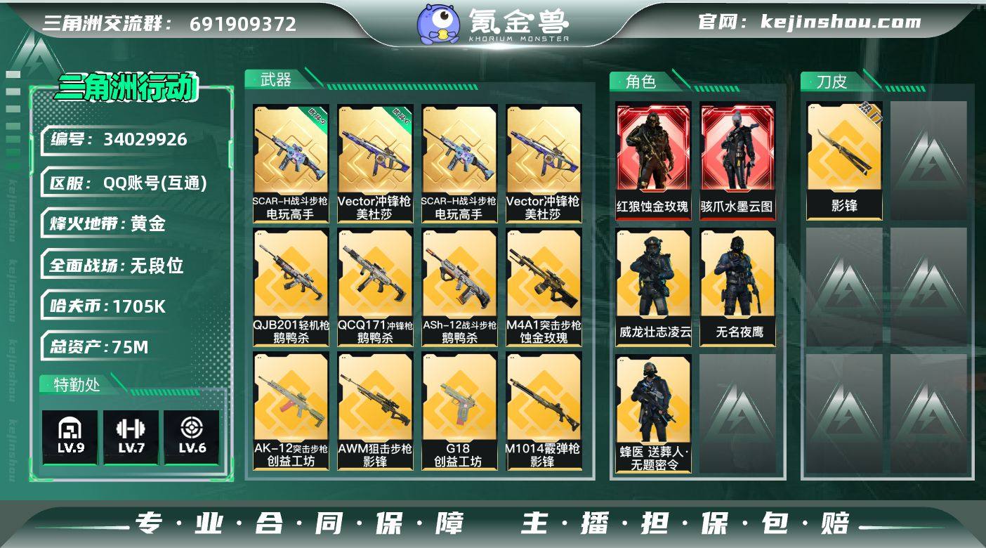 【PTSJZ5188】总资产75M/哈夫币170万/传说近战数1/传说枪皮数27/战场等级1/行动等级60/安全箱等时效性道具以游戏内数据为准,详情请看图/红狼-蚀金玫瑰/骇爪-水墨云图/威龙-壮志凌云(S3)/蜂医-送葬人·无题密令(S5)/无名-夜鹰(S4)/近战-影锋/近战-黑鹰/SCAR-H战斗步枪-电玩高手/Vector冲锋枪-美杜莎/优品S典藏武器外观-SCAR-H战斗步枪-电玩高手/优品C典藏武器外观-Vector冲锋枪-美杜莎/M4A1突击步枪-蚀金玫瑰/M4A1突击步枪-阿米娅/ASh-12战斗步枪-鹅鸭杀/AUG突击步枪-西装暴徒/AK-12突击步枪-创益工坊/AK-12突击步枪-夜鹰/SCAR-H战斗步枪-铁艺苍穹/SCAR-H战斗步枪-水墨云图/SCAR-H战斗步枪-启航/CAR-15突击步枪-阿米娅/腾龙突击步枪-捞点薯条/SMG45冲锋枪-骑士/勇士冲锋枪-能天使-午夜邮差/QCQ171冲锋枪-鹅鸭杀/M1014霰弹枪-影锋/725双管霰弹枪-送葬人-无题密令/M250通用机枪-骑士之心/QJB201轻机枪-鹅鸭杀/R93狙击步枪-维什戴尔/M700狙击步枪-创益工坊/AWM狙击步枪-影锋/AWM狙击步枪-捞点薯条/G18-创益工坊/93R-捞点薯条/复合弓-黑-天际线/K416突击步枪-暗鸦(典藏)/P90冲锋枪-暗鸦(典藏)/M1014霰弹枪-暗鸦(典藏)/Vector冲锋枪-潜袭者(典藏)/M4A1突击步枪-特勤执行/AKM突击步枪...