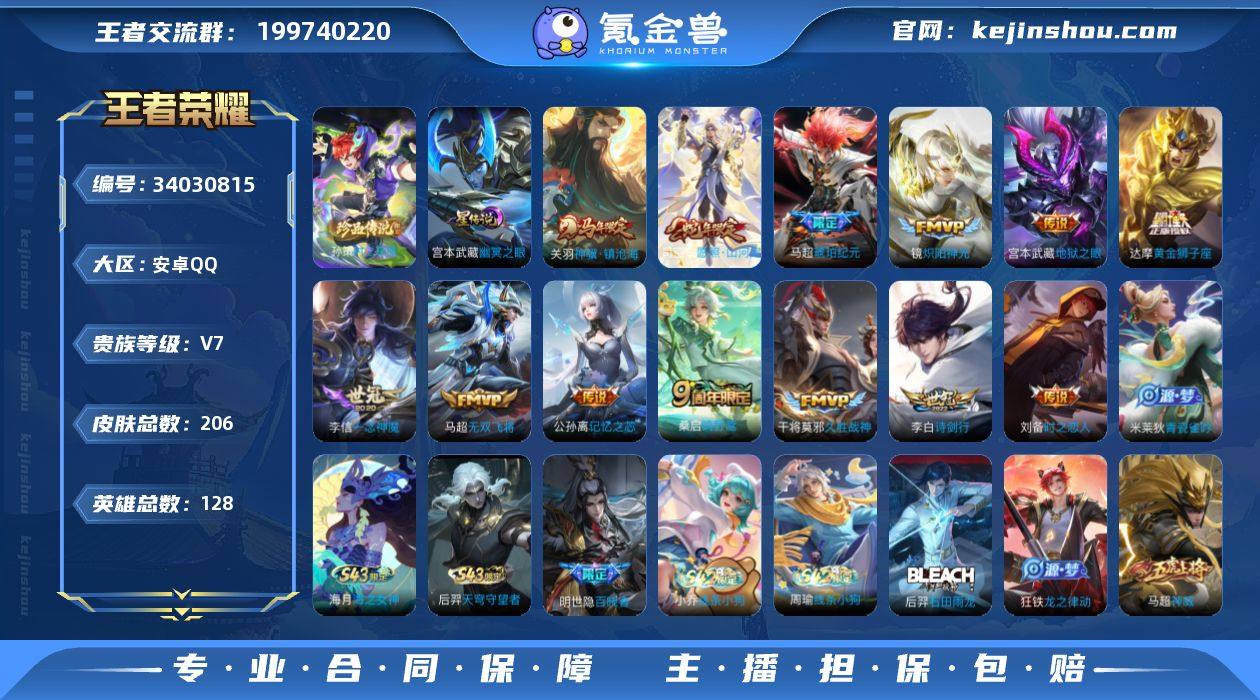 安卓Q-V7-至尊星耀II段位-128英雄-203皮肤-1珍品传说-13传说-53史诗 【英雄全皮】:司空震全皮 【珍品传说】:孙策时之奇旅 【传说皮肤】:关羽神骥镇沧海,司空震愿照山河定,桑启鸣野蒿,马超琥珀纪元,公孙离记忆之芯,李白诗剑行,马超无双飞将,镜炽阳神光,李信一念神魔,刘备时之恋人,干将莫邪久胜战神,达摩黄金狮子座,宫本武藏地狱之眼 【限定皮肤】:蔡文姬夏日便利店,虞姬夏日便利店,姜子牙天穹之誓,杨戬破阵退雄兵,狄仁杰阴阳师,赵云皇家上将,赵云龙胆,高渐离死亡摇滚,钟无艳超时空战士,元歌无心,甄姬落雪兰心,狄仁杰魔术师,项羽海滩派对,兰陵王金庭之子,李元芳云中旅人,鬼谷子五谷丰年,裴擒虎擒涛扼浪,鲁班大师探海日志,桑启海盐诗旅,司空震地狱燃心,张良古海寻踪,鬼谷子天穹祈灯,马超琥珀纪元,姬小满妄想食味,沈梦溪龙舞盛年,刘邦剑破天穹,程咬金群星魔术团,镜青焰无极,项羽苍威无极,周瑜熔金海岸 【年限皮肤】:司空震愿照山河定 【赛季限定】:兰陵王金庭之子,李元芳云中旅人,桑启海盐诗旅,裴擒虎擒涛扼浪,鲁班大师探海日志,张良古海寻踪,鬼谷子天穹祈灯,刘邦剑破天穹,姜子牙天穹之誓,东皇太一噬灭天穹,太乙真人谧...