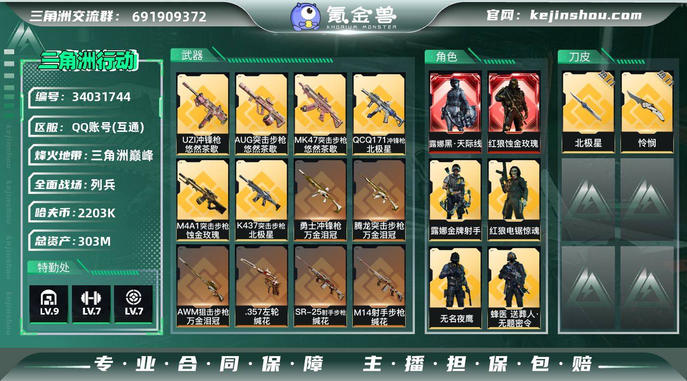 【PTSJZ4117】总资产303M/哈夫币220万/传说近战数1/传说枪皮数32/战场等级19/行动等级60/安全箱等时效性道具以游戏内数据为准,详情请看图/红狼-蚀金玫瑰/露娜-黑·天际线/蜂医-送葬人·无题密令(S5)/无名-夜鹰(S4)/红狼-电锯惊魂/露娜-金牌射手(S7)/近战-北极星/近战-怜悯/近战-黑鹰/M4A1突击步枪-蚀金玫瑰/M4A1突击步枪-阿米娅/AUG突击步枪-悠然茶歇/SG552突击步枪-运动员/AK-12突击步枪-夜鹰/AK-12突击步枪-特斯拉线圈/SCAR-H战斗步枪-水墨云图/SCAR-H战斗步枪-启航/G3战斗步枪-骑士/CAR-15突击步枪-黑鹰坠落/CAR-15突击步枪-阿米娅/腾龙突击步枪-捞点薯条/腾龙突击步枪-万金泪冠/K437突击步枪-北极星/KC17突击步枪-电锯惊魂/MK47突击步枪-悠然茶歇/UZI冲锋枪-特斯拉线圈/UZI冲锋枪-悠然茶歇/SMG45冲锋枪-骑士/SR-3M紧凑突击步枪-特斯拉线圈/勇士冲锋枪-能天使-午夜邮差/勇士冲锋枪-万金泪冠/QCQ171冲锋枪-北极星/725双管霰弹枪-送葬人-无题密令/M14射手步枪-缄花/SKS射手步枪-骑士/SR-25射手步枪-缄花/AWM狙击步枪-捞点薯条/AWM狙击步枪-万金泪冠/.357左轮-缄花/93R-捞点薯条/复合弓-黑-天际线/AKM突击步枪-林中猎手/QBZ95-1突击步枪-ACE/Ash-12战斗步枪-守夜人/K416突击步...
