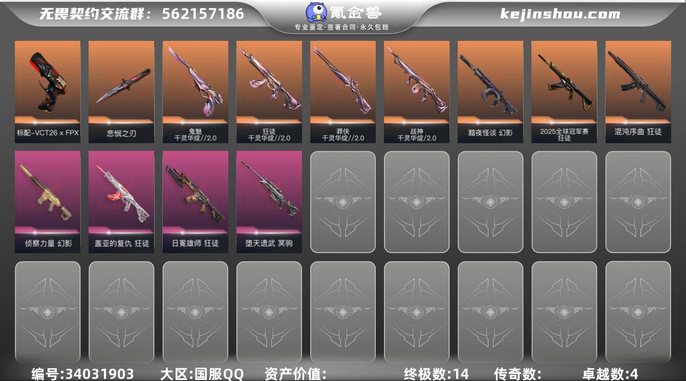 【套装】:无畏契约季前邀请赛套装,千灵华绽//2.0套装 【英雄】:幻棱,炼狱,维斯,暮蝶,钛狐,壹决,铁臂,捷风,雷兹,幽影,不死鸟,贤者,猎枭,零,芮娜,奇乐,尚勃勒,霓虹,斯凯,夜露,星礈,K/O,盖可,黑梦,钢锁 【近战武器】:近战武器-蒙太奇 战斧,近战武器-碎心裂刃,近战武器-无畏契约季前邀请赛 悲悯之刃,近战武器-流风回雪,近战武器-影钩,近战武器-夜刃诡镰 【狂徒】:狂徒-2025全球冠军赛,狂徒-混沌序曲,狂徒-千灵华绽//2.0,狂徒-盖亚的复仇,狂徒-日冕雄师 【幻影】:幻影-黯夜怪谈,幻影-侦察力量,幻影-蒙太奇 【冥驹】:冥驹-堕天遗武 【莽侠】:莽侠-千灵华绽//2.0 【战神】:战神-千灵华绽//2.0,战神-蒙太奇 【骇灵】:骇灵-无限竞技,骇灵-蒙太奇 【VCT手枪】:标配-VCT26 x FPX 【鬼魅】:鬼魅-千灵华绽//2.0 【狂怒】:狂怒-蒙太奇 【卡面】:从黄昏到黎明 卡面,Clutch 卡面,虹吸式咖啡壶 卡面,无畏契约GO!第一卷:芮娜 卡面,无畏契约GO!第一卷:零 卡面,暗枪 卡面,钢锁vs盖可 卡面,别冒尖 卡面,壹决工牌 卡面,代号红色 卡面,新兵报到 卡面,V契约 卡面,无畏契约 卡面 【喷漆】:加油!加油! 喷漆,买装还是存钱 喷漆,...