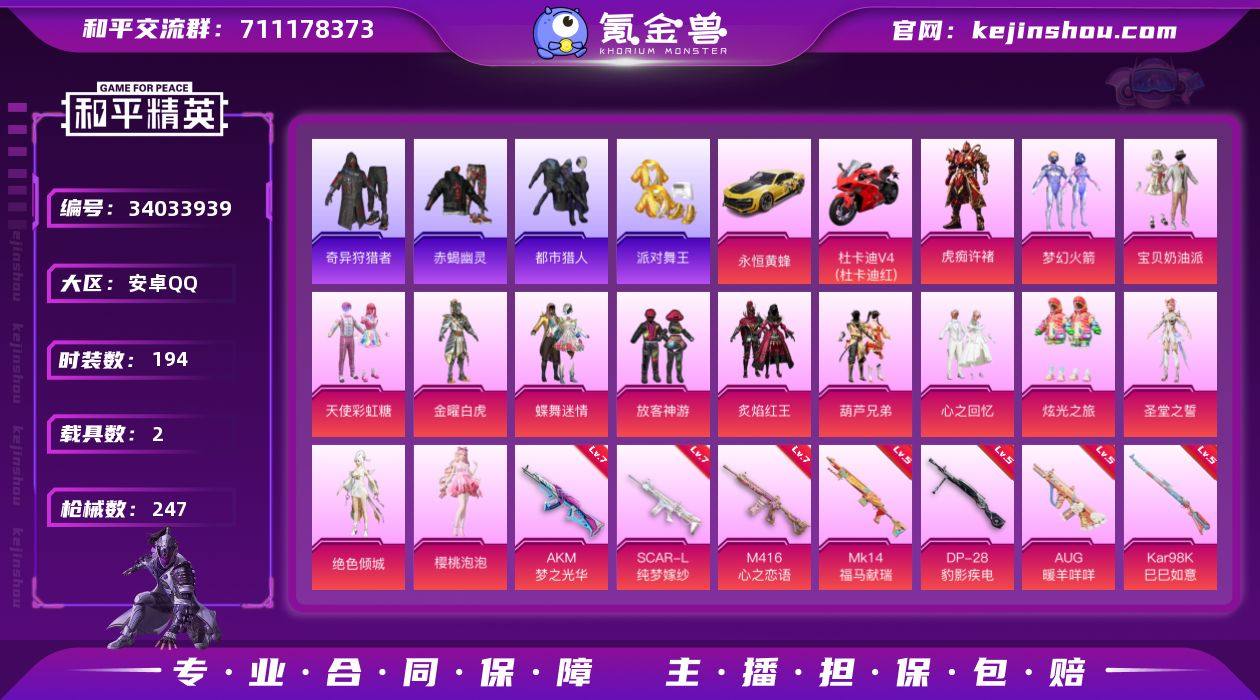 194套装/枪械7/装备292/载具2/战备158/王牌印记14/热力值82486/七级AKM-梦之光华/七级SCAR-L-纯梦嫁纱/七级M416-心之恋语/五级AUG-暖羊咩咩/五级Kar98K-巳巳如意/五级MK14-福马献瑞/五级DP-28-豹影疾电/梦幻火箭(新101)/浪漫天命/赤蝎幽灵/都市猎人/派对舞王/奇异狩猎者/金羽特工/龟仙人/暗影哥特/熔岩游骑兵连帽夹克/宝贝奶油派/天使彩虹糖/金曜白虎/蝶舞迷情/放客神游/炙焰红王/葫芦兄弟/心之回忆/炫光之旅/圣堂之誓/绝色倾城/樱桃泡泡/虎痴许褚/永恒黄蜂/杜卡迪 Panigale V4(杜卡迪红)/AKM梦之光华/SCAR-L纯梦嫁纱/M416心之恋语/AUG-暖羊咩咩/Kar98K-巳巳如意/MK14-福马献瑞/DP-28-豹影疾电/梦幻火箭飞行器/沙丘之主天马飞行器/绝色倾城飞行器/深海曼妙降落伞/幻影战神降落伞/粉色回忆降落伞/甜心宝贝降落伞/梦幻火箭降落伞/甜蜜誓约降落伞/四圣焕新降落伞/阿狸红降落伞/葫芦兄弟降落伞/暗夜玫瑰降落伞/蓝莓炮弹降落伞/恐龙拽拽降落伞/妙趣可丽降落伞/灵感创作师降落伞/彩虹甜喵降落伞/暗夜鎏金降落伞/第五大道降落伞/黄族统领降落伞/莲影清波降落伞/猪猪侠降落伞/花傲天降落伞/绝色倾城降落伞/江南烟雨降落伞/巴啦啦小魔仙降落伞/千金淑猫降落伞/鬼刀降落伞/樱桃泡泡降落...