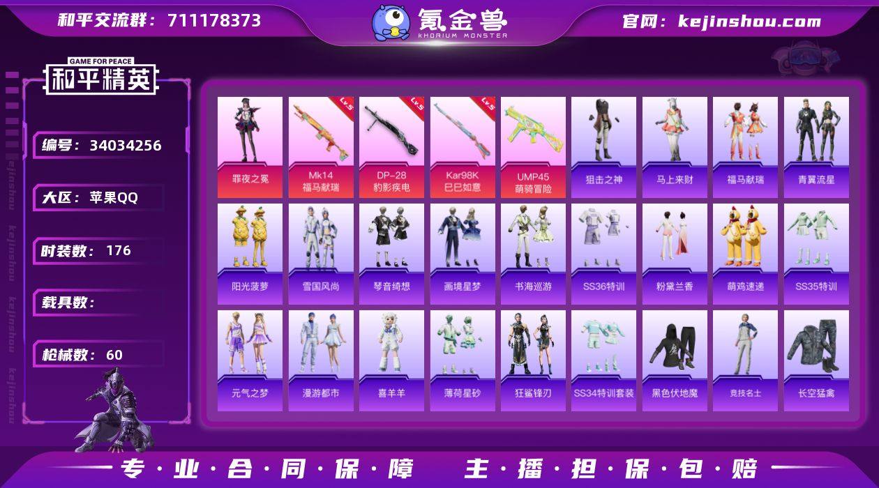 实名: 可修改 时装数: 176 枪械数: 60 热门装扮: 罪夜之冕 稀有枪皮: Kar98K-巳巳如意,DP-28-豹影疾电,MK14-福马献瑞,UMP45-萌骑冒险