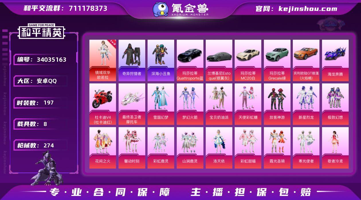 W16532 可立即换绑无需挂单养号 安卓 手Q-1神装-19粉装-18特效枪-8载具-8粉色飞行器-113274热力值-18王牌印记-197套装-274枪皮 【红色神装等级】:镜域双华-欧若拉(三级) 【红色角色神装】:镜域双华-欧若拉 【热门品类】:粉装-雪国幻梦,粉装-梦幻火箭,套装-浪漫天命,套装-深海小丑鱼,套装-小丑鱼,套装-奇异狩猎者,角色-军刀雅典娜,套装-龟仙人,套装-暗影哥特,套装-浪漫波比 【粉色套装】:粉装-宝贝奶油派,粉装-天使彩虹糖,粉装-雪国幻梦,粉装-梦幻火箭,粉装-放客神游,粉装-新星烈龙,粉装-极致幻想,粉装-花间之火,粉装-馨动时刻,粉装-彩虹鹿灵,粉装-山涧鹿灵,角色-洛天依,粉装-彩虹甜喵,粉装-霞光圣骑,粉装-寒光使者,角色-歌者泠鸢,粉装-镜光幻境,角色-圣堂之誓,角色-月影灵韵 【粉色枪皮等级】:AKM-甜心宝贝(五级),SCAR-L-梦幻火箭(四级),SCAR-L-时空协奏(三级),M416-超新星(三级),GROZA-焦糖拿铁(五级),AUG-圣斗士星矢(六级),M762-甜蜜誓约(四级),UMP45-启明星(五级),Vector-最终圣卫者(三级),AKS-74U-森灵之息(四级),P90-甜蜜草莓(四级),Kar98K-巳巳如意(五级),M24-镜域双华(三级),Mk14-福马献瑞(一级),DP-28-豹影疾电(五...