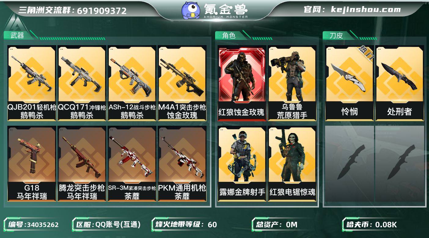 89m总资产-89k哈夫币-60烽火等级-钻石-46战场等级-列兵 【干员外观】:红狼-蚀金玫瑰,红狼-电锯惊魂,露娜-金牌射手,乌鲁鲁-荒原猎手 【近战皮肤】:近战-怜悯,近战-处刑者1级,近战-黑鹰 【传说外观】:M4A1突击步枪-蚀金玫瑰,M4A1突击步枪-阿米娅,ASh-12战斗步枪-鹅鸭杀,K416突击步枪-行动记录,SG552突击步枪-运动员,AK-12突击步枪-特斯拉线圈,SCAR-H战斗步枪-启航,SCAR-H战斗步枪-荼蘼,G3战斗步枪-骑士,CAR-15突击步枪-阿米娅,腾龙突击步枪-捞点薯条,腾龙突击步枪-马年祥瑞,KC17突击步枪-电锯惊魂,UZI冲锋枪-特斯拉线圈,SR-3M紧凑突击步枪-特斯拉线圈,SR-3M紧凑突击步枪-荼蘼,勇士冲锋枪-能天使-午夜邮差,QCQ171冲锋枪-鹅鸭杀,PKM通用机枪-荼蘼,M250通用机枪-骑士之心,QJB201轻机枪-鹅鸭杀,M14射手步枪-蛮荒,M14射手步枪-缄花,SKS射手步枪-骑士,SR-25射手步枪-缄花,AWM狙击步枪-捞点薯条,.357左轮-缄花,G18-马年祥瑞,93R-捞点薯条,复合弓-黑·天际线 【史诗外观】:AKM突击步枪-林中猎手,QBZ95-1突击步枪-曙光,ASh-12战斗步枪-无极限,K416突击步枪-冬日风情,K416突击步枪-腊梅,K416突击步枪-阿萨拉特攻,M16A4突击步枪-竞赛选手,AUG...