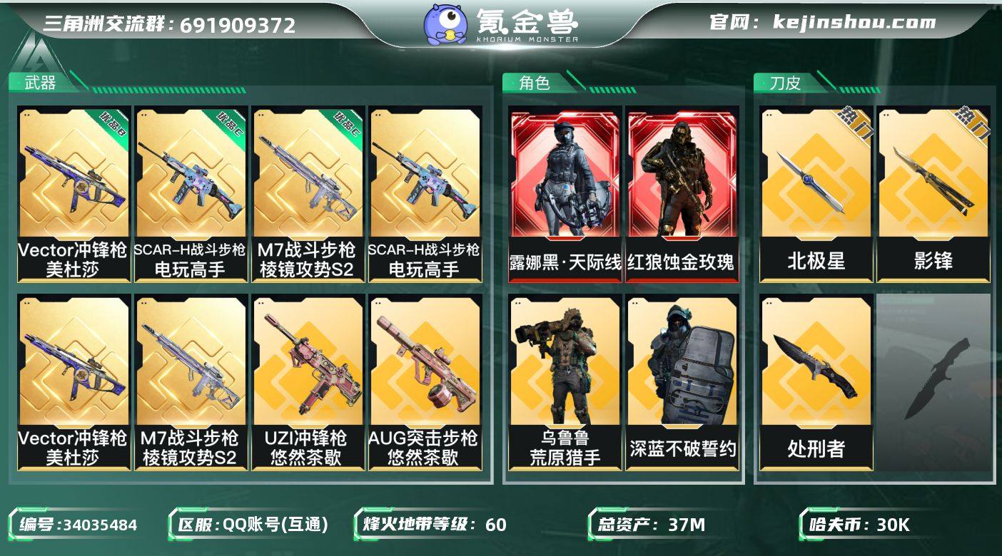【热门搭配组合:双红皮+三刀皮+三典藏枪皮+飞虎-饰金玫瑰+黑天际线+北极星+影锋+处刑者1级】【Q区三端互通】【无二次】YXz9779-特勤处:仓库8级/靶场6级/训练中心6级 总资产37m-哈夫币3w-60烽火等级-黑鹰-50战场等级-上等兵 【干员外观】:红狼-蚀金玫瑰,露娜-黑·天际线,威龙-壮志凌云,威龙-飞虎,蜂医-送葬人·无题密令,无名-夜鹰,深蓝-不破誓约,乌鲁鲁-荒原猎手 【近战皮肤】:近战-北极星,近战-影锋,近战-处刑者1级,近战-黑鹰 【典藏外观】:SCAR-H战斗步枪-电玩高手,Vector冲锋枪-美杜莎,M7战斗步枪-棱镜攻势S2 【典藏外观成色】:SCAR-H战斗步枪-电玩高手(优品C),Vector冲锋枪-美杜莎(优品B),M7战斗步枪-棱镜攻势S2(优品C) 【传说外观】:M4A1突击步枪-蚀金玫瑰,M4A1突击步枪-阿米娅,K416突击步枪-行动记录,AUG突击步枪-悠然茶歇,M7战斗步枪-机动小队,AK-12突击步枪-夜鹰,AK-12突击步枪-特斯拉线圈,SCAR-H战斗步枪-铁艺苍穹,SCAR-H战斗步枪-启航,CAR-15突击步枪-黑鹰坠落,CAR-15突击步枪-阿米娅,AS Val突击步枪-蛇年祥瑞,腾龙突击步枪-捞点薯条,K437突击步枪-几何解构,KC17突击步枪-电锯惊魂,MK47突击步枪-悠然茶歇,UZI冲锋枪-特斯拉线圈,...