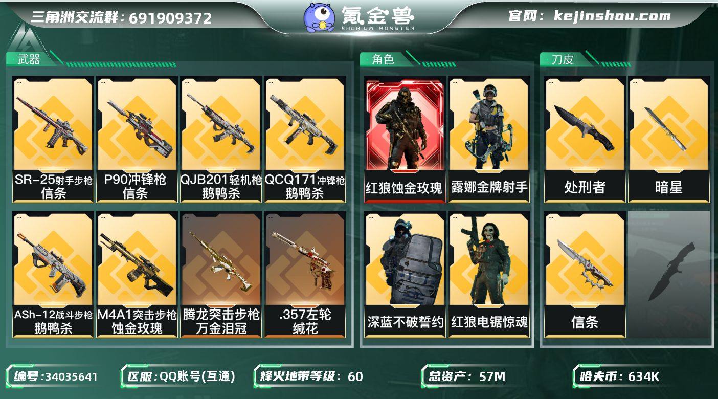 【热门组合搭配:蚀金玫瑰+双刀-暗星+信条】【Q区三端互通】【【无二协助处理】】YXz9390-特勤处:仓库7级/靶场4级/训练中心6级-总资产57m-哈夫币63w-烽火等级:60级 【干员外观】:红狼-蚀金玫瑰,深蓝-不破誓约,红狼-电锯惊魂,露娜-金牌射手 【近战皮肤】:近战-暗星,近战-信条,近战-处刑者1级,近战-黑鹰 【传说外观】:M4A1突击步枪-蚀金玫瑰,ASh-12战斗步枪-鹅鸭杀,K416突击步枪-行动记录,SG552突击步枪-运动员,SCAR-H战斗步枪-启航,腾龙突击步枪-万金泪冠,KC17突击步枪-电锯惊魂,P90冲锋枪-信条,QCQ171冲锋枪-鹅鸭杀,M250通用机枪-骑士之心,QJB201轻机枪-鹅鸭杀,M14射手步枪-蛮荒,M14射手步枪-缄花,SR-25射手步枪-信条,SR-25射手步枪-缄花,R93狙击步枪-维什戴尔,.357左轮-缄花 【史诗外观】:ASh-12战斗步枪-无极限,K416突击步枪-冬日风情,K416突击步枪-腊梅,AUG突击步枪-蝮蛇,M7战斗步枪-百步穿杨,SG552突击步枪-哈夫克警备,G3战斗步枪-流沙送葬,AS Val突击步枪-百步穿杨,腾龙突击步枪-猎鳄行动,K437突击步枪-守护者,MP5冲锋枪-深海恐惧,MP5冲锋枪-战术竞备,MP5冲锋枪-竞技风,Vector冲锋枪-阿萨拉文明,Vector冲锋枪-百步穿杨,SMG-4...
