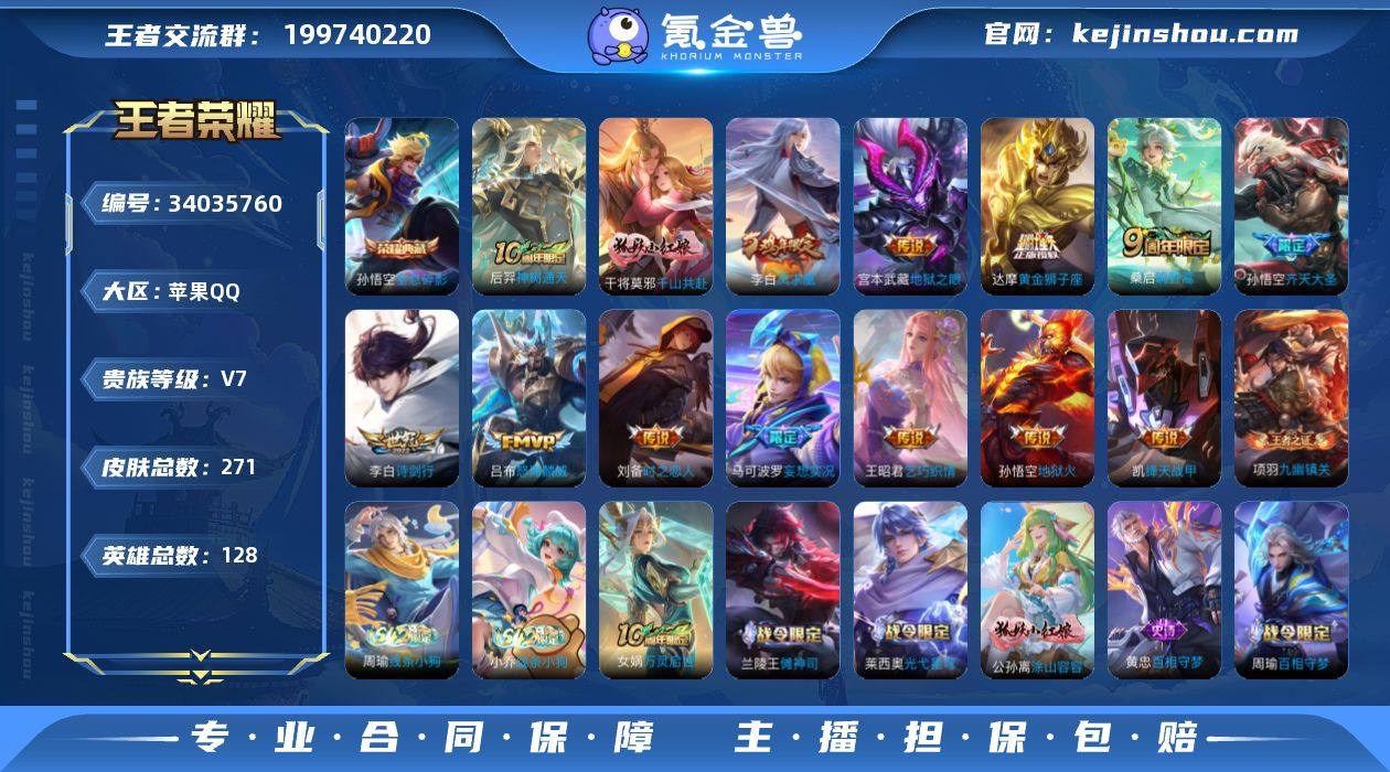 贵族等级7/荣耀典藏数量1/传说皮肤数量14/史诗皮肤数量71/皮肤数量271/英雄数量128/段位至尊星耀/金标高渐离/孙权全皮/敖隐全皮/空空儿全皮/全息碎影/神树通天/千山共赴/鸣野蒿/妄想实况/齐天大圣/怒海麟威/诗剑行/乞巧织情/绛天战甲/时之恋人-刘备/黄金狮子座/凤求凰/地狱之眼/地狱火/狰(s8)/虞姬夏日便利店/阴阳师/凯尔特女王(s7)/皇家上将/白昼王子/蔷薇恋人/蜃楼王(s4)/高山流水/玩趣恶龙/妖精王(s5)/炼金王(s6)/重明(s11)/幻夜卜梦/猎兽之王/无心/朔风刀(s17)/游园惊梦/烛龙(s10)/穷奇(s12)/魔术师/万华元夜(s22)/沙漠行僧(s26)/海滩派对/醍醐杖(s20)/演武夺筹(s23)/金庭之子(s27)/至尊宝/孙行者/御旌(s15)/圣弓游侠/云中旅人(s29)/驱傩正仪(s24)/真爱魔法/繁星吟游/饕餮(s9)/原初探秘者(s21)/五谷丰年/火炮绅士/千军破阵(s25)/原初追遂者/混沌棋(s18)/顽趣-梦奇/大漠名商(s28)/疑决卦(s19)/李小龙/擒涛扼浪(s31)/御狮(s13)/御霄(s14)/猪悟能/梁祝/拒霜思/探海日志(s32)/海盐诗旅(s30)/女武神/江河有灵/古海寻踪(s33)/蒙恬荣光圣徽/鬼谷子天穹祈灯(S34)/剑破天穹(s35)/噬灭天穹(s37)/虚灵犬护/逆浪荇歌/荣光之誓/九幽镇关/鸭鸭历险记-刘禅/鸭鸭历险记-沈梦溪/百相守梦-周...
