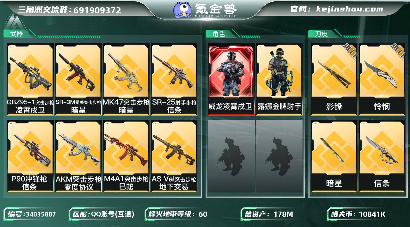 【赛季热门单红+多热门刀皮号】【凌霄戍卫+暗星+信条+影锋+怜悯】【Q区三端互通】【无二次】YXz8768-特勤处:仓库9级/靶场7级/训练中心7级-总资产176.6m-哈夫币1084w-烽火等级:60级 【热门藏品】:非洲之心 【干员外观】:威龙-凌霄戍卫,露娜-金牌射手 【近战皮肤】:近战-暗星,近战-信条,近战-影锋,近战-怜悯,近战-黑鹰 【传说外观】:M4A1突击步枪-巳蛇,AKM突击步枪-零度协议,QBZ95-1突击步枪-凌霄戍卫,ASh-12战斗步枪-怜悯,K416突击步枪-白鹰军团,M7战斗步枪-零度协议,M7战斗步枪-巳蛇,SG552突击步枪-运动员,SCAR-H战斗步枪-水墨云图,SCAR-H战斗步枪-荼蘼,AS Val突击步枪-地下交易,腾龙突击步枪-马年祥瑞,腾龙突击步枪-万金泪冠,MK47突击步枪-暗星,P90冲锋枪-信条,SR-3M紧凑突击步枪-暗星,SR-3M紧凑突击步枪-荼蘼,勇士冲锋枪-万金泪冠,PKM通用机枪-钢铁意志,PKM通用机枪-荼蘼,M14射手步枪-蛮荒,M14射手步枪-缄花,SKS射手步枪-骑士,SR-25射手步枪-信条,SR-25射手步枪-缄花,AWM狙击步枪-万金泪冠,.357左轮-缄花,G18-马年祥瑞 【史诗外观】:K416突击步枪-冬日风情,K416突击步枪-腊梅,AUG突击步枪-蝮蛇,AUG突击步枪-甜心子弹,M7战斗步枪...