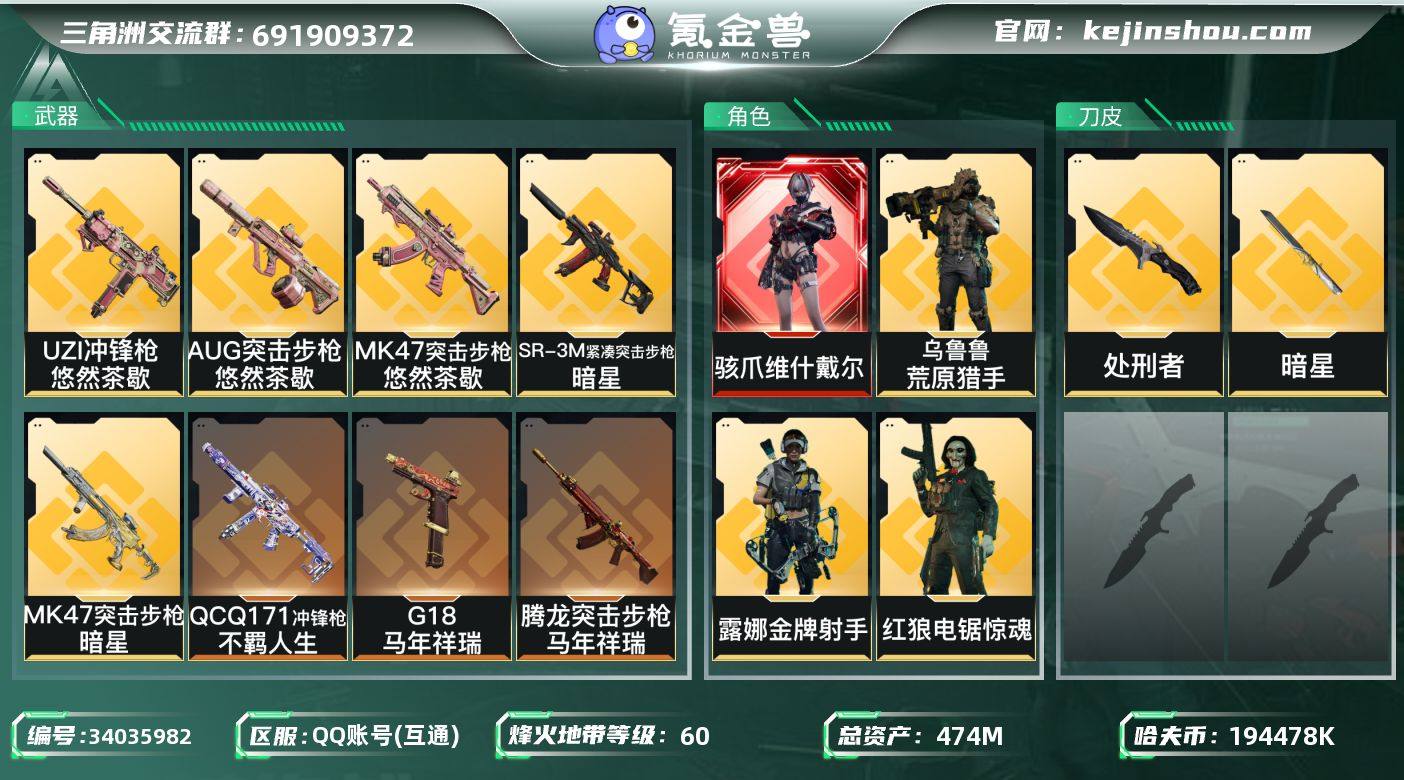 【高额资产474M.单红+单刀暗星-维什戴尔】【Q区三端互通】【无二次】YXz9452-特勤处:仓库9级/靶场7级/训练中心7级-总资产474m-哈夫币194m-烽火等级:60级 【干员外观】:骇爪-维什戴尔,红狼-电锯惊魂,露娜-金牌射手,乌鲁鲁-荒原猎手 【近战皮肤】:近战-暗星,近战-处刑者1级,近战-黑鹰 【传说外观】:AKM突击步枪-锦绣,K416突击步枪-行动记录,AUG突击步枪-悠然茶歇,SG552突击步枪-运动员,SCAR-H战斗步枪-启航,腾龙突击步枪-马年祥瑞,K437突击步枪-锦绣,KC17突击步枪-电锯惊魂,MK47突击步枪-悠然茶歇,MK47突击步枪-暗星,Vector冲锋枪-夜莺,UZI冲锋枪-悠然茶歇,SMG-45冲锋枪-锦绣,SR-3M紧凑突击步枪-暗星,QCQ171冲锋枪-不羁人生,MK4冲锋枪-夜莺,Mini-14射手步枪-夜莺,M14射手步枪-蛮荒,SKS射手步枪-骑士,R93狙击步枪-维什戴尔,G18-马年祥瑞 【史诗外观】:AKM突击步枪-逆战未来,QBZ95-1突击步枪-曙光,K416突击步枪-冬日风情,K416突击步枪-腊梅,M7战斗步枪-百步穿杨,SG552突击步枪-哈夫克警备,SCAR-H战斗步枪-囚徒,G3战斗步枪-流沙送葬,G3战斗步枪-哈夫克警备,AS Val突击步枪-百步穿杨,腾龙突击步枪-猎鳄行动,K437突击步枪-丛影谍踪,MP5冲...