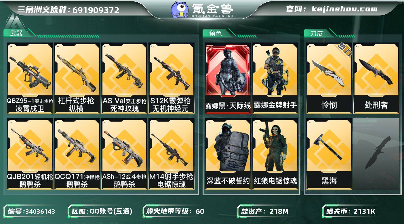 【热门皮肤号:S8赛季顶级安全箱3X3.单红皮+三刀皮+五金皮】【黑天际线+怜悯+黑海+处刑者1级】【Q区三端互通】【无二次】YXz9052-特勤处:仓库10级/靶场7级/训练中心7级-总资产218m-哈夫币213w-烽火等级:60级 【干员外观】:露娜-黑·天际线,蜂医-送葬人·无题密令,无名-夜鹰,深蓝-不破誓约,红狼-电锯惊魂,露娜-金牌射手 【近战皮肤】:近战-黑海,近战-怜悯,近战-处刑者1级,近战-黑鹰 【传说外观】:M4A1突击步枪-阿米娅,QBZ95-1突击步枪-凌霄戍卫,ASh-12战斗步枪-鹅鸭杀,K416突击步枪-行动记录,M16A4突击步枪-狩猎时刻,SG552突击步枪-运动员,AK-12突击步枪-夜鹰,SCAR-H战斗步枪-启航,G3战斗步枪-狩猎时刻,CAR-15突击步枪-黑鹰坠落,CAR-15突击步枪-阿米娅,AS Val突击步枪-死神玫瑰,腾龙突击步枪-捞点薯条,腾龙突击步枪-马年祥瑞,腾龙突击步枪-万金泪冠,K437突击步枪-北极星,KC17突击步枪-电锯惊魂,MP5冲锋枪-黑海,Vector冲锋枪-狩猎时刻,UZI冲锋枪-流光铂影,SMG-45冲锋枪-骑士,勇士冲锋枪-能天使-午夜邮差,勇士冲锋枪-万金泪冠,QCQ171冲锋枪-鹅鸭杀,S12K霰弹枪-无机神经元,725双管霰弹枪-送葬人-无题密令,M250通用机枪-骑士之心,QJB201轻机...