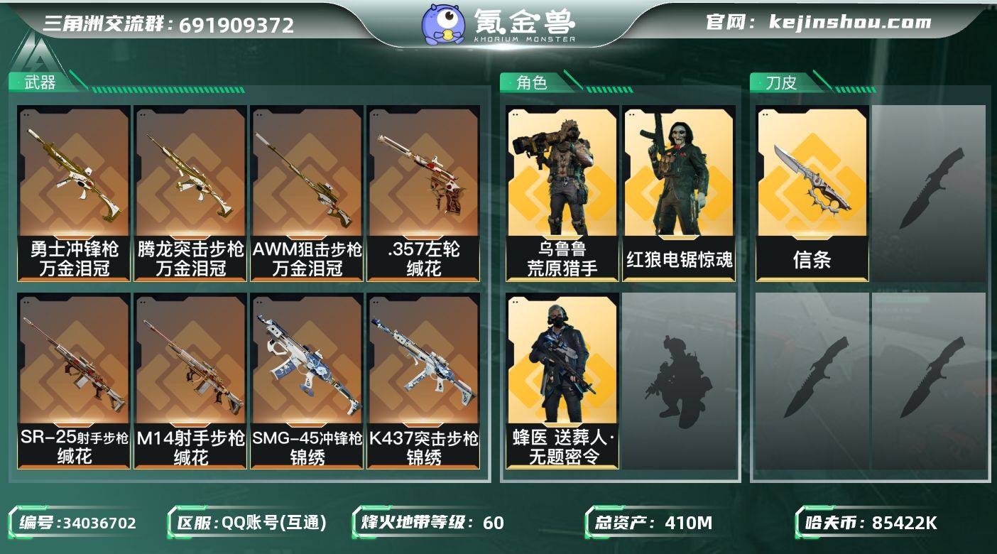【大额资产410M+刀皮信条】【Q区三端互通】【无二次协助处理】YXz9904-特勤处:仓库9级/靶场4级/训练中心6级-410m总资产-8542w哈夫币-60烽火等级-黑鹰-1战场等级-无军衔 【干员外观】:蜂医-送葬人·无题密令,红狼-电锯惊魂,乌鲁鲁-荒原猎手 【近战皮肤】:近战-信条,近战-黑鹰 【传说外观】:M4A1突击步枪-阿米娅,AKM突击步枪-锦绣,M16A4突击步枪-狩猎时刻,AK-12突击步枪-特斯拉线圈,SCAR-H战斗步枪-启航,G3战斗步枪-狩猎时刻,CAR-15突击步枪-阿米娅,腾龙突击步枪-万金泪冠,K437突击步枪-锦绣,KC17突击步枪-电锯惊魂,Vector冲锋枪-狩猎时刻,UZI冲锋枪-特斯拉线圈,SMG-45冲锋枪-骑士,SMG-45冲锋枪-锦绣,SR-3M紧凑突击步枪-特斯拉线圈,勇士冲锋枪-能天使-午夜邮差,勇士冲锋枪-万金泪冠,725双管霰弹枪-送葬人-无题密令,M14射手步枪-蛮荒,M14射手步枪-缄花,SR-25射手步枪-水墨云图,SR-25射手步枪-缄花,AWM狙击步枪-万金泪冠,.357左轮-缄花,复合弓-黑·天际线 【史诗外观】:AKM突击步枪-林中猎手,QBZ95-1突击步枪-曙光,K416突击步枪-冬日风情,K416突击步枪-腊梅,K416突击步枪-阿萨拉特攻,M16A4突击步枪-竞赛选手,AUG突击步枪-蝮蛇,AUG突击步枪-...