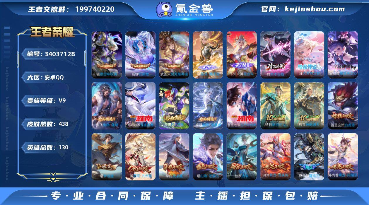 贵族等级9/荣耀典藏数量3/传说皮肤数量46/史诗皮肤数量132/皮肤数量438/英雄数量130/段位最强王者/墨子全皮/嬴政全皮/刘禅全皮/刘邦全皮/孙权全皮/敖隐全皮/曜全皮/蒙恬全皮/暃全皮/赵怀真全皮/戈娅全皮/空空儿全皮/影全皮/少司缘全皮/武则天/倪克斯神谕/银白咏叹调/幻阙歌/器灵·螭龙剑/花合斗/朽木白哉/酷洛米之心/大耳狗之梦/兔狲·蓬尾/器灵·落星盏/时之奇旅-孙策/江户川柯南/怪盗基德/云缨神骥越千峰/马超神骥逐星野/花木兰异界灵契/纵目迁山/神树通天/星之鸣奏/愿照·九州拓/幻光神枪/玄雷天君/映山客/鸣野蒿/夏侯惇霜北刀/黄金天蝎座/乘龙·问璇玑/乘龙·淬吴钩/乘龙·铭钟鼎/霜月吟/鹤归松栖(云缨)/鹤羽星尊/电玩·雷克斯/百相守梦(张飞)/记忆之芯/浮生妄/齐天大圣/山海·苍雷引/怒海麟威/碎云/补天/李逍遥/炽阳神光/启明星使/云鹰飞将/一念神魔/太华/黄金白羊座/久胜战神/云霓雀翎/白虎志/冠军飞将/胖达荣荣/黄金射手座/武陵仙君/仲夏夜之梦/凤求凰/地狱之眼/海洋之心/墨染江湖/埋骨钱/蒙犽顽岩魄/蔡文姬夏日便利店/虞姬夏日便利店/天穹之誓(s36)/破阵·退雄兵/谪仙醉月/阴阳师/皇家上将/引擎之心/神迹守卫-墨子/降魔/优雅恋人/白昼王子/蔷薇恋人/高山流水/超时空战士-钟无艳/...